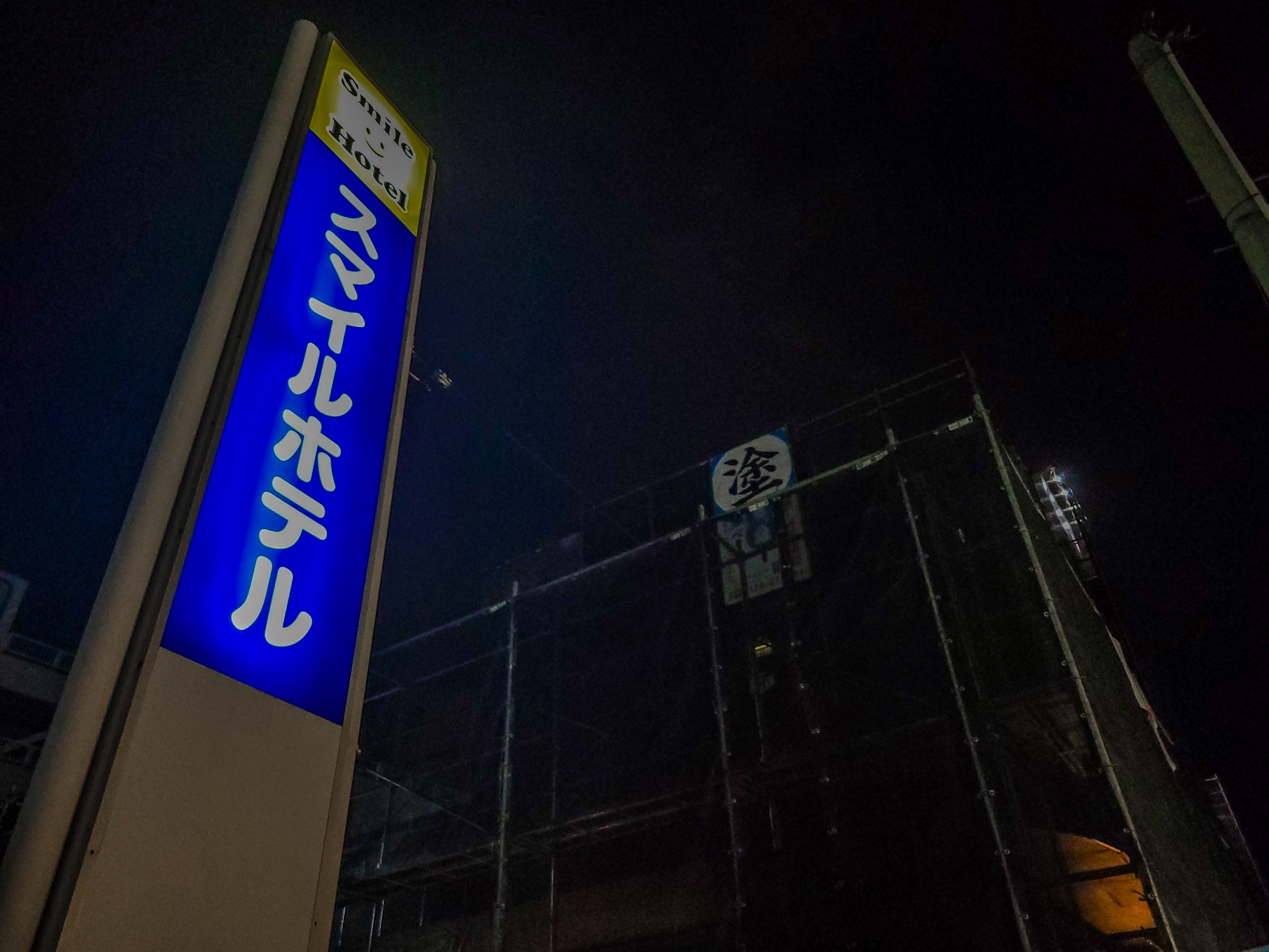 宿泊は三日町通りの1本裏手にあるスマイルホテル。改装中ですが、外装を黒くしているようで少し不気味な雰囲気。