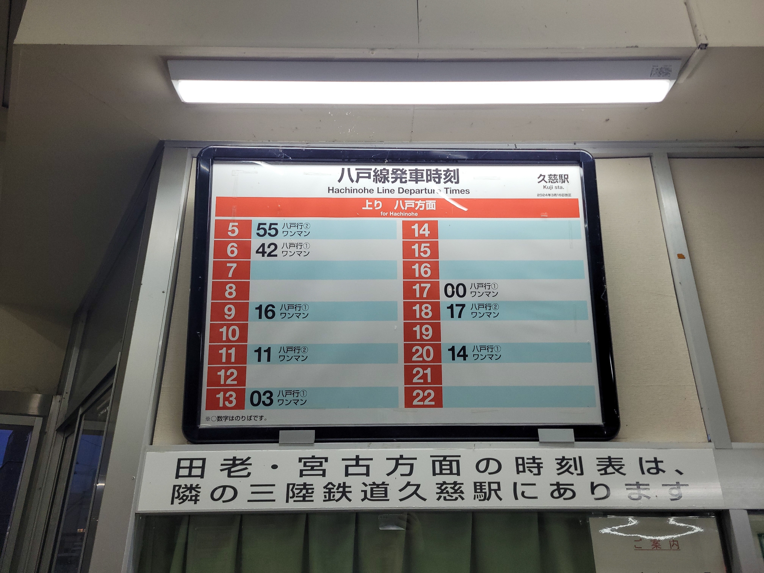 久慈駅から八戸方面はJR東日本。八戸線こんなに本数少なかったのか…。乗車する17:00発の前が13:03ってなかなかキツイね。