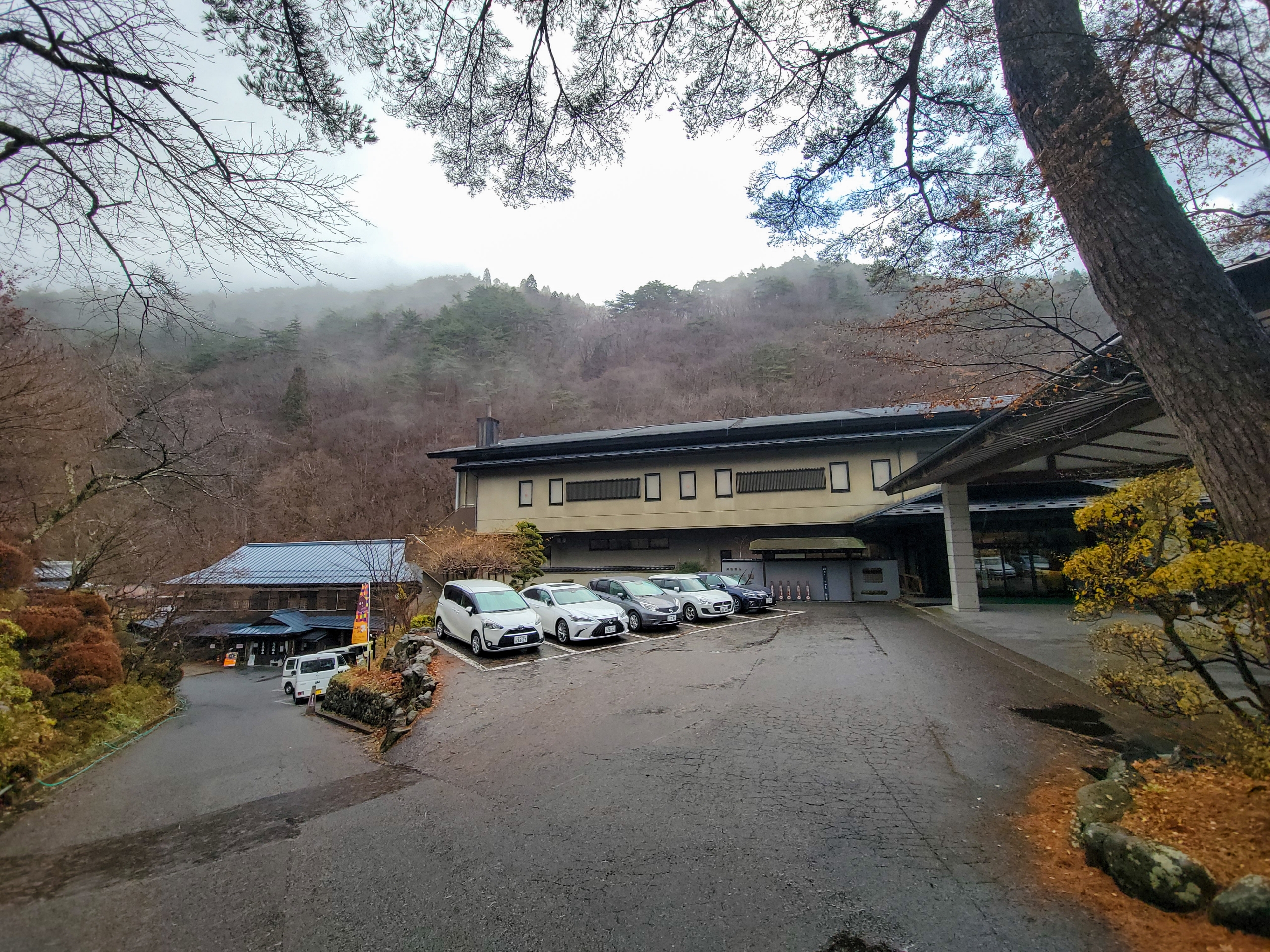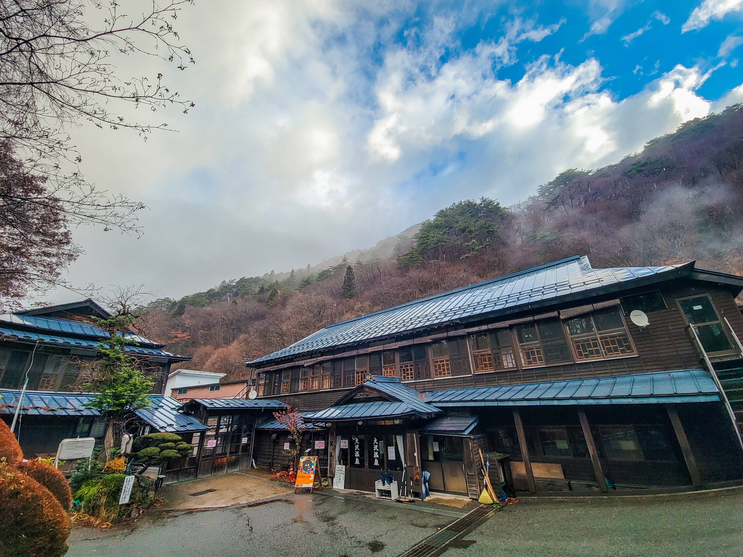 左奥が湯治屋、右手前がホテルタイプの山水館。両方とも大沢温泉の施設です。ついさっきまで晴れてたのに、山に雲がかかり始めました。
