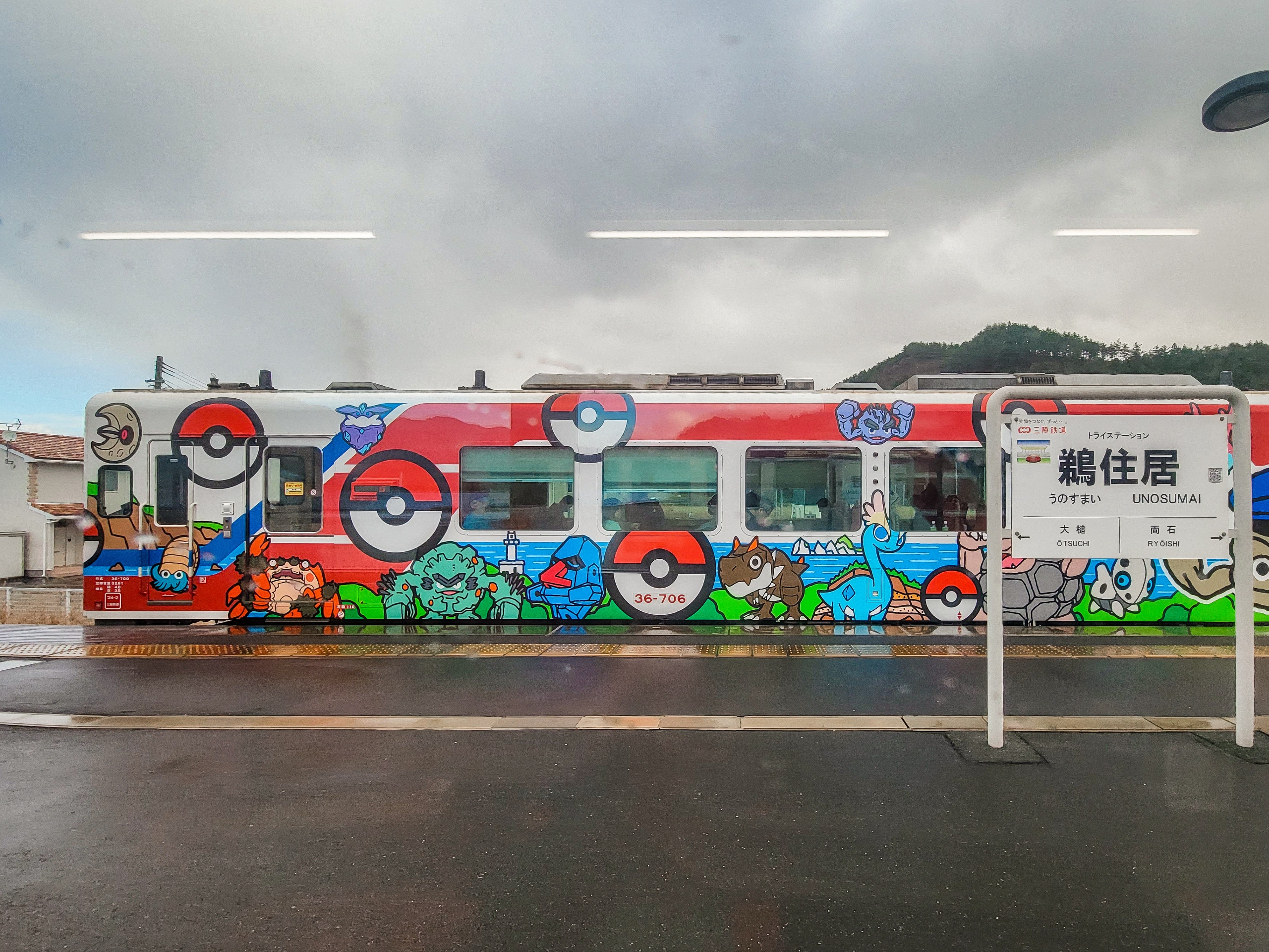 鵜住居駅でラッピング車両「三陸鉄道イシツブテ&いわポケモントレイン」が列車交換。2026年3月末まで久慈―盛駅間を不定期で運行。岩”に“手”が付いている見た目から「イシツブテ」が、「岩手」を象徴しているということで、「いわて応援ポケモン」に選ばれたそうです。