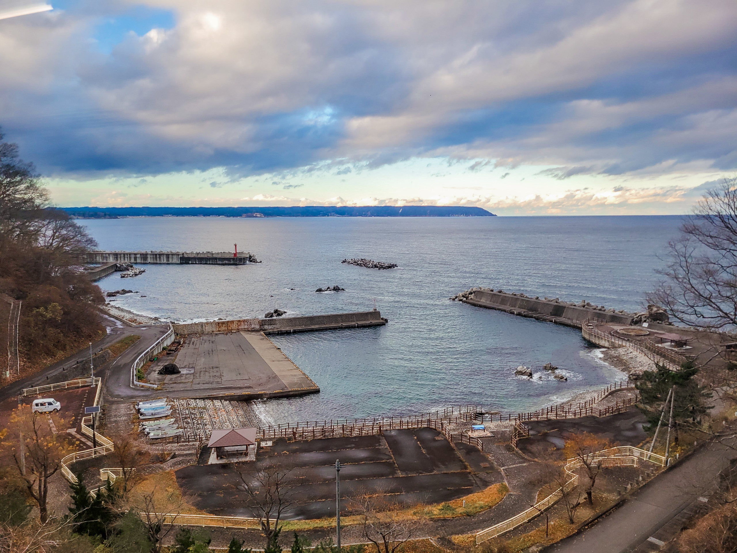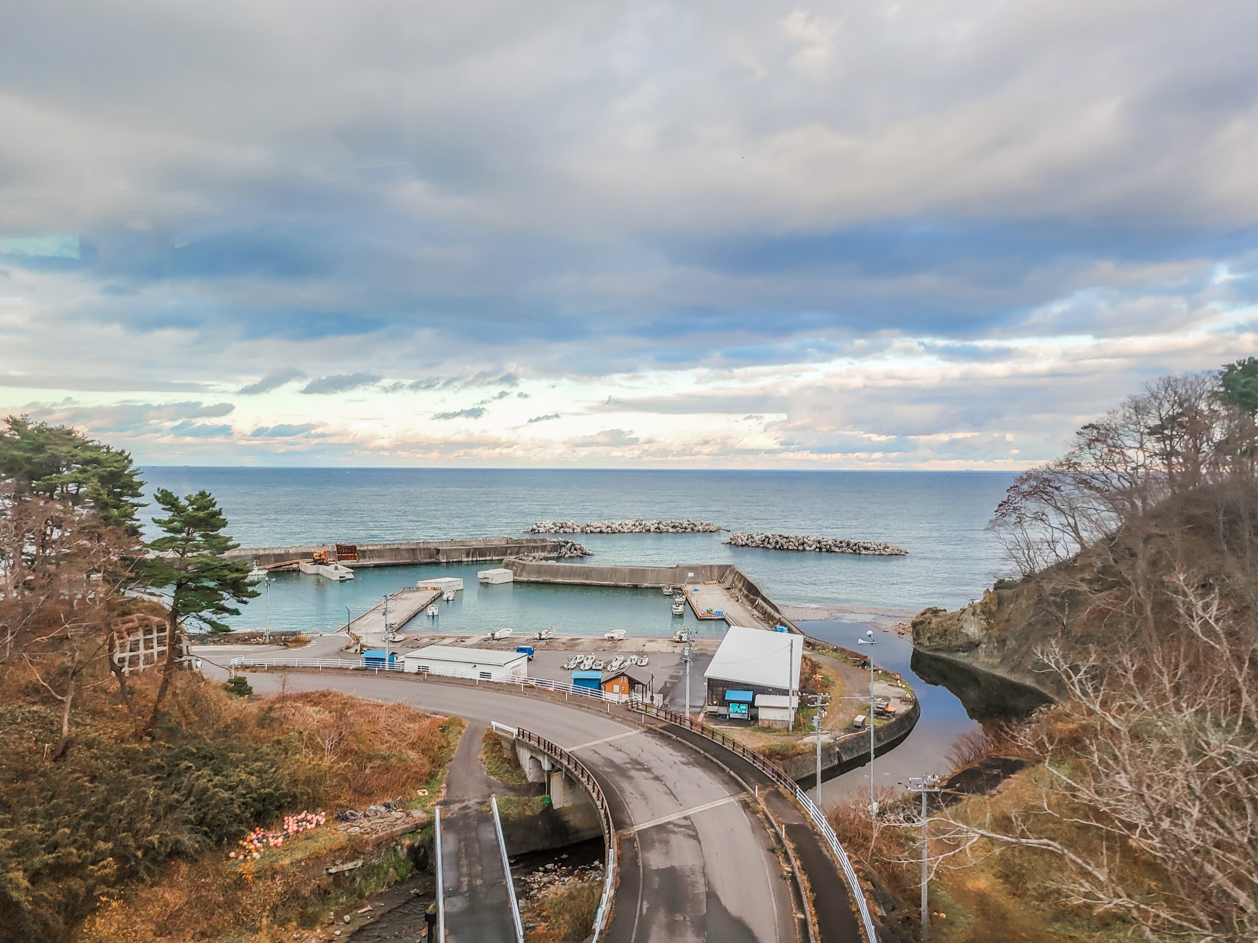 岩手船越駅前の船越港。結果的には、宮古までの間で見れた最後の海になりました。