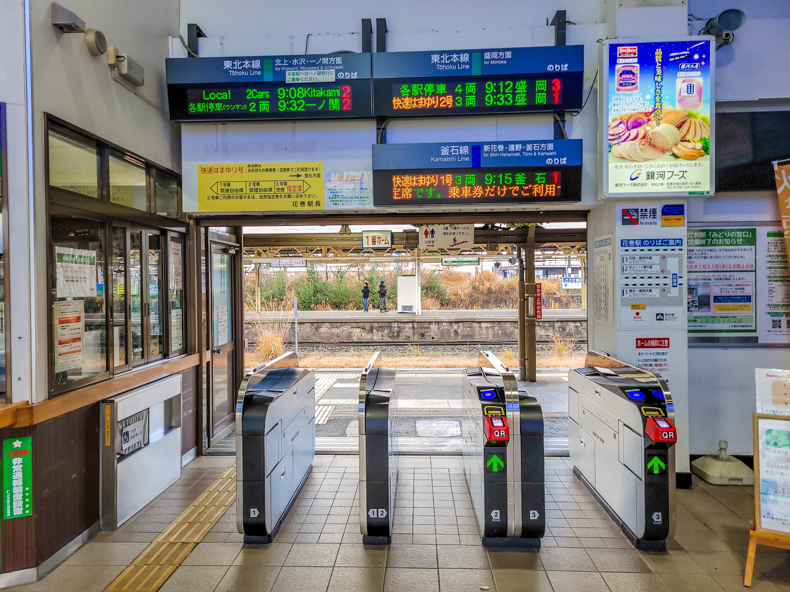 自動改札はQR対応済みですね。大沢温泉からご一緒してた男性の方は、新花巻駅から盛岡駅に行かれるとの事でしたが、在来線のほうが早く到着するはずなので、乗換案内で調べて在来線をおススメしました。新幹線のほうが早いという先入観があったのでしょうね。