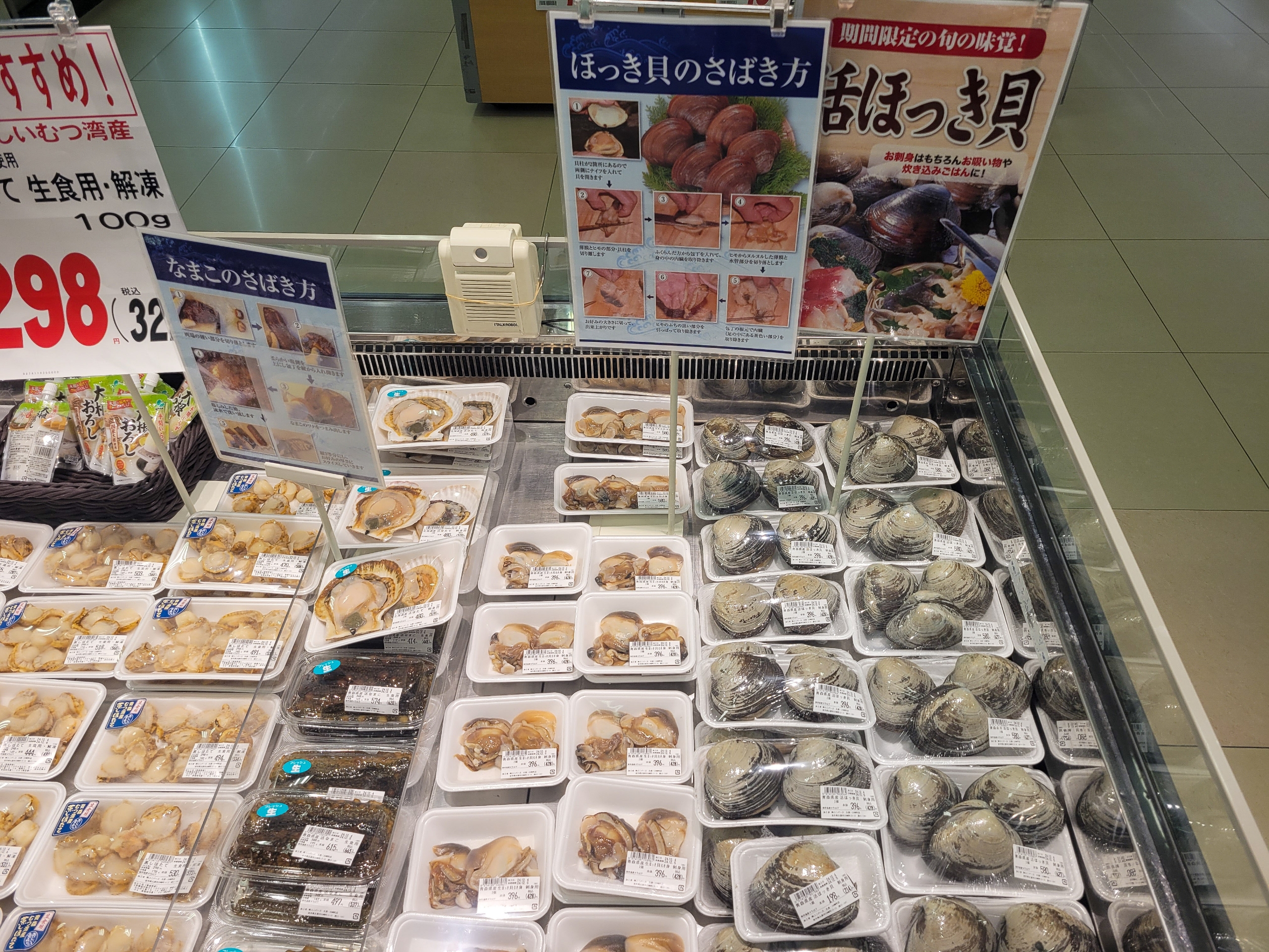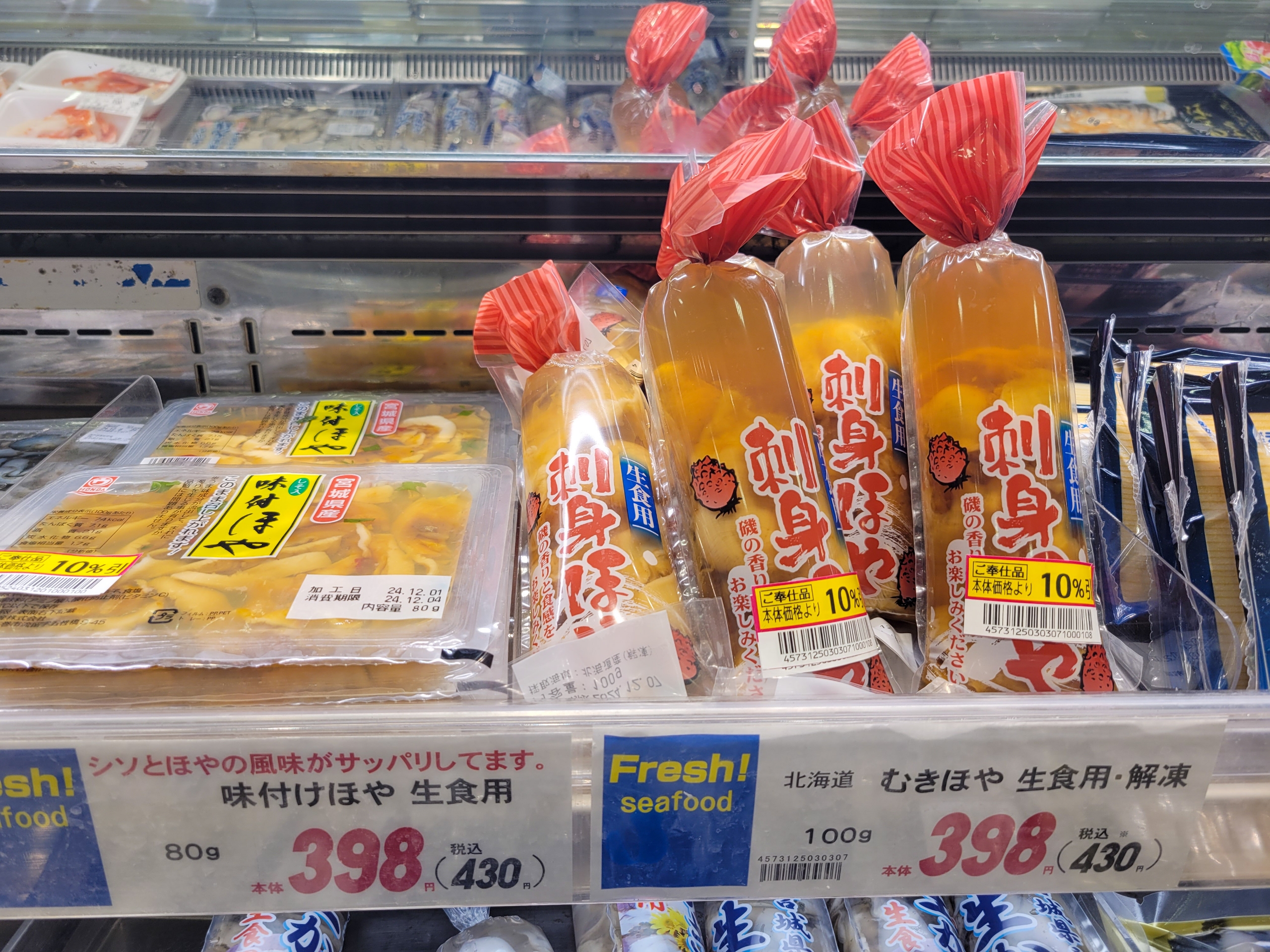 北寄貝が普通に売ってる。北海道にいっても、意外と北海道民って海鮮食べないらしく、スーパーで鮮魚コーナーにいっても、品揃えが良いことが少ないんですよね。特に札幌とかね。
