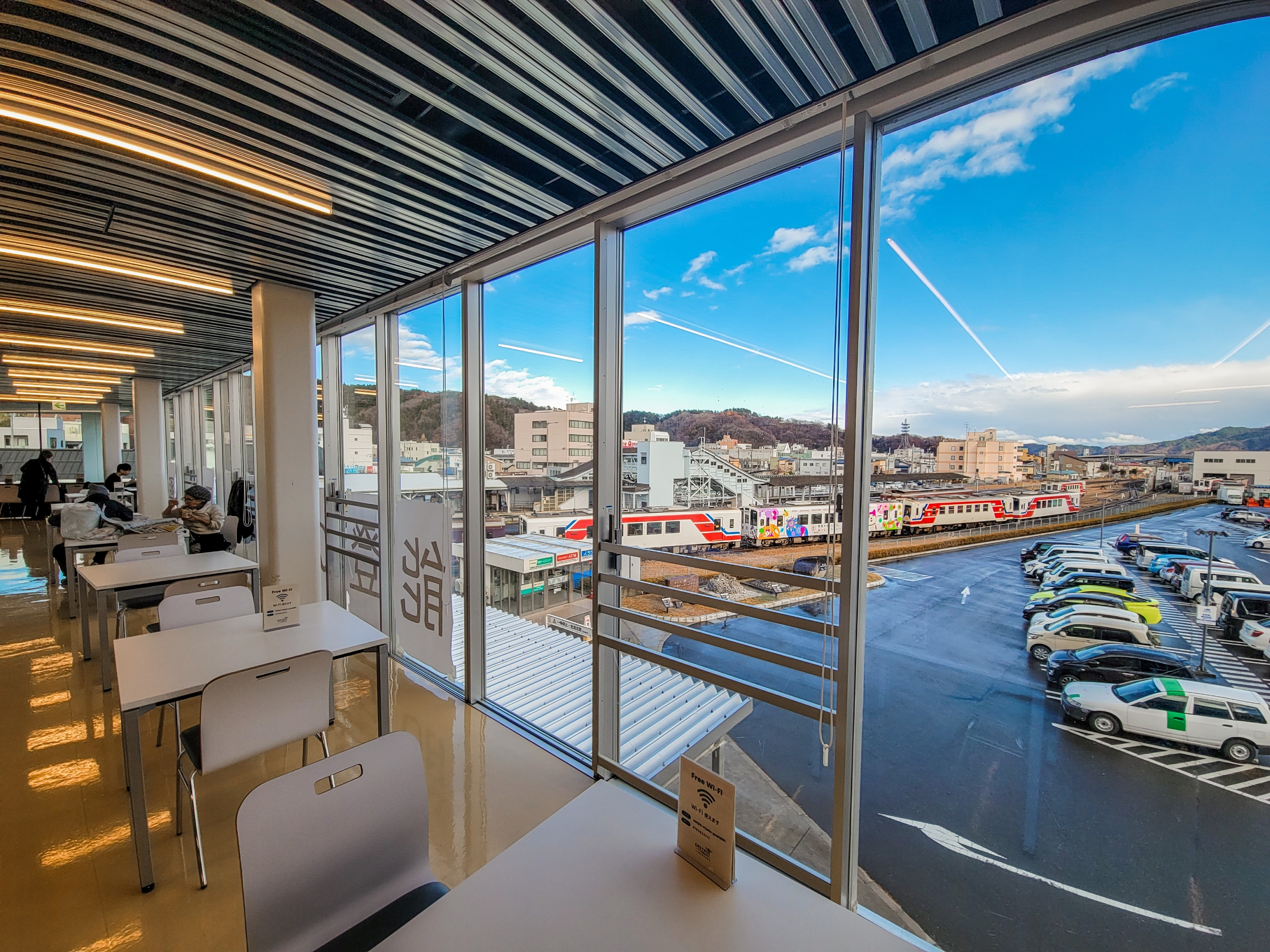 市役所がはいっている「イーストピアみやこ」の2階にフリースペースがあったので、そこで昼食を頂きます。市役所の旧庁舎は、東日本大震災の津波により浸水被害を受け、老朽化も進んでいたため、新庁舎への建て替えが行われ2018年に完成したばかり。三陸鉄道ビューでとても綺麗な席でした。