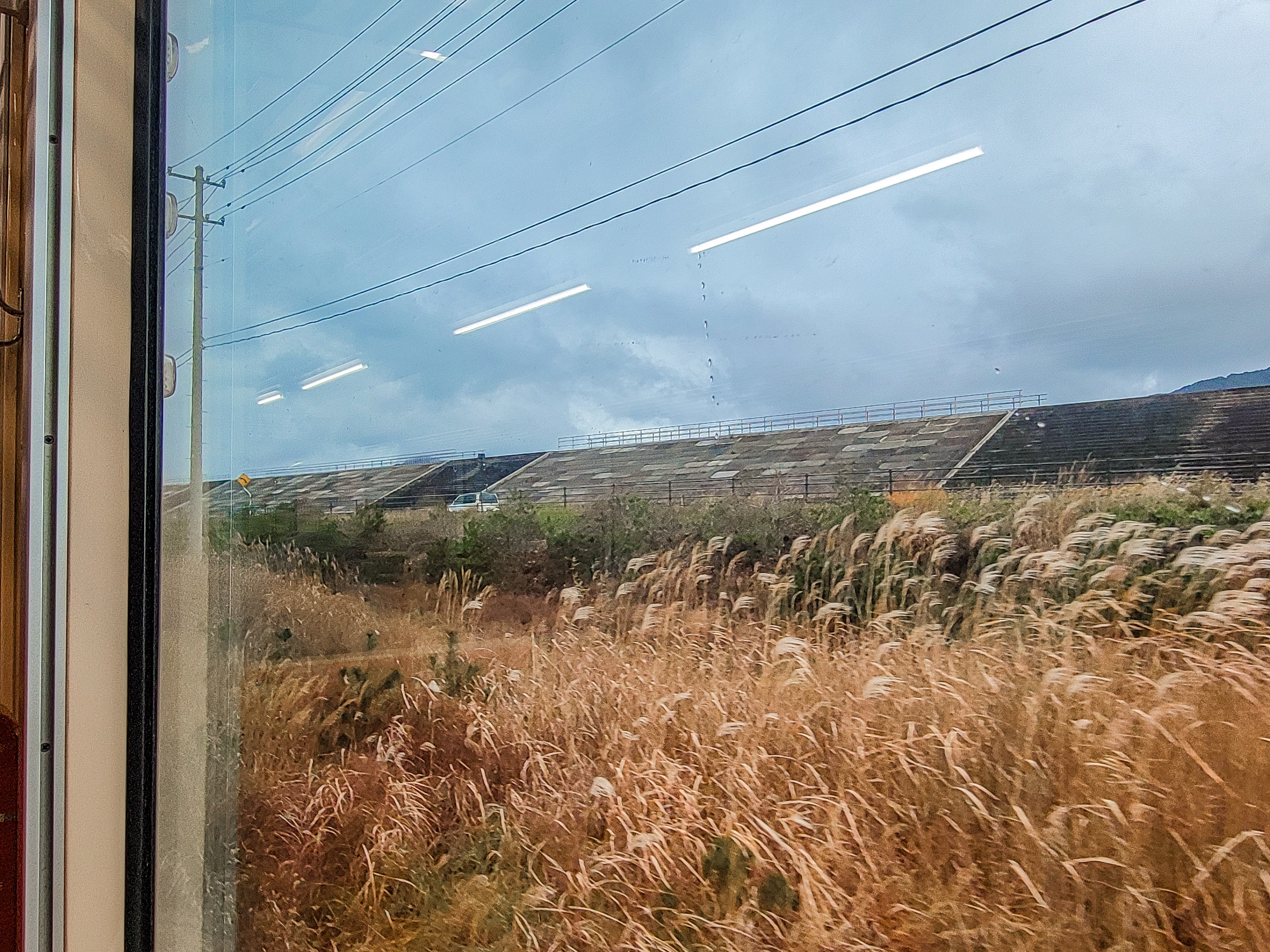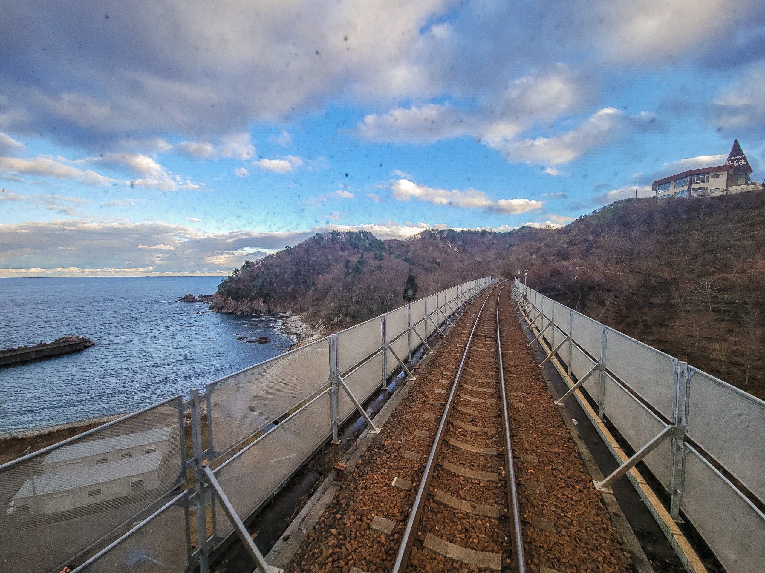 大沢橋梁からすぐですが、ここでも徐行してくれました。晴れてたら美しく見えそうな海です。