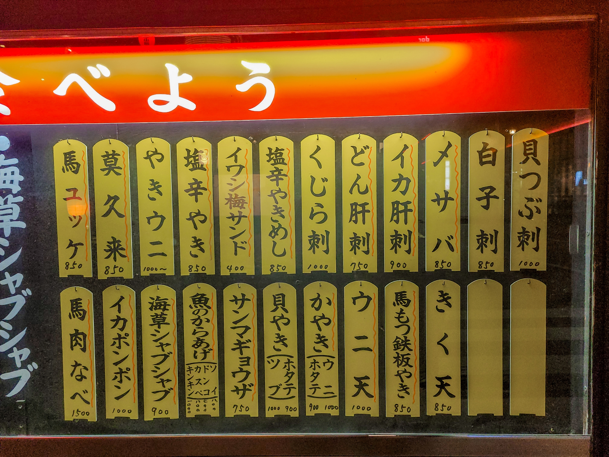 とある居酒屋の魅力的なラインナップ。どれも美味しそうな珍味だらけで、日本酒が止まらない未来が見えます。夕食の食材を買ってきてしまったことを少し後悔しました。