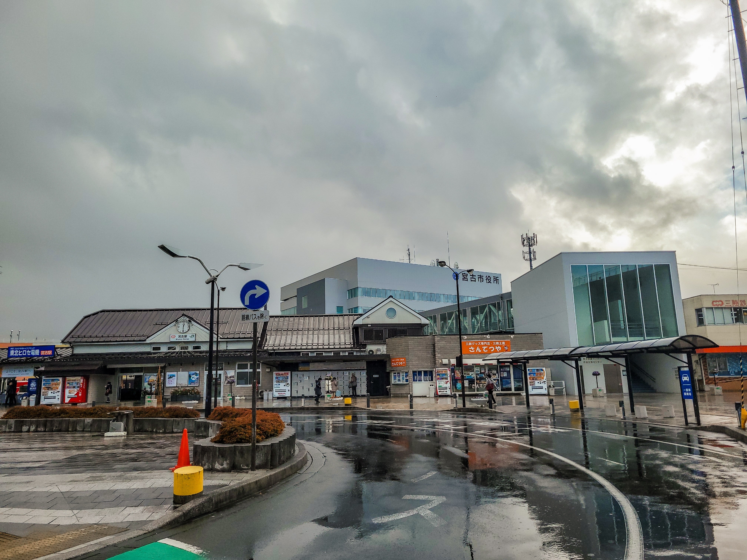 道路はすごい濡れてます。雨雲レーダーで確認したら、雨雲は通り過ぎたようなので、散策スタート。宮古駅の裏側に新しく宮古市役所が建てられて、連絡通路で結ばれているようです。