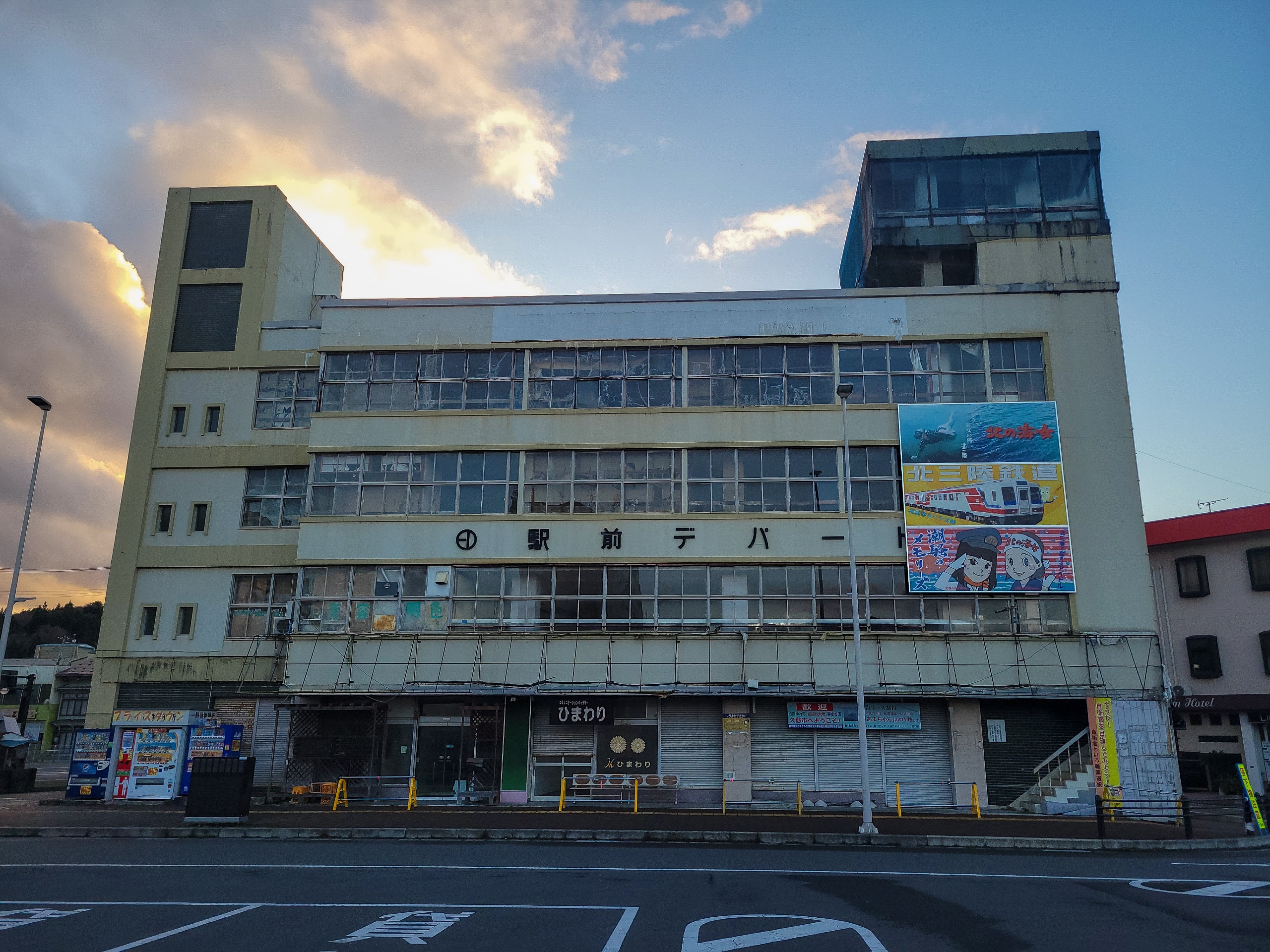 久慈駅の目の前にある駅前デパートは、昭和40年(1965年)に建設されたレトロな雰囲気が漂う建物で「あまちゃん」で登場しました。すでにレトロを通りこしていて、老朽化のためテナントは退去しており、ビルは閉鎖されています。