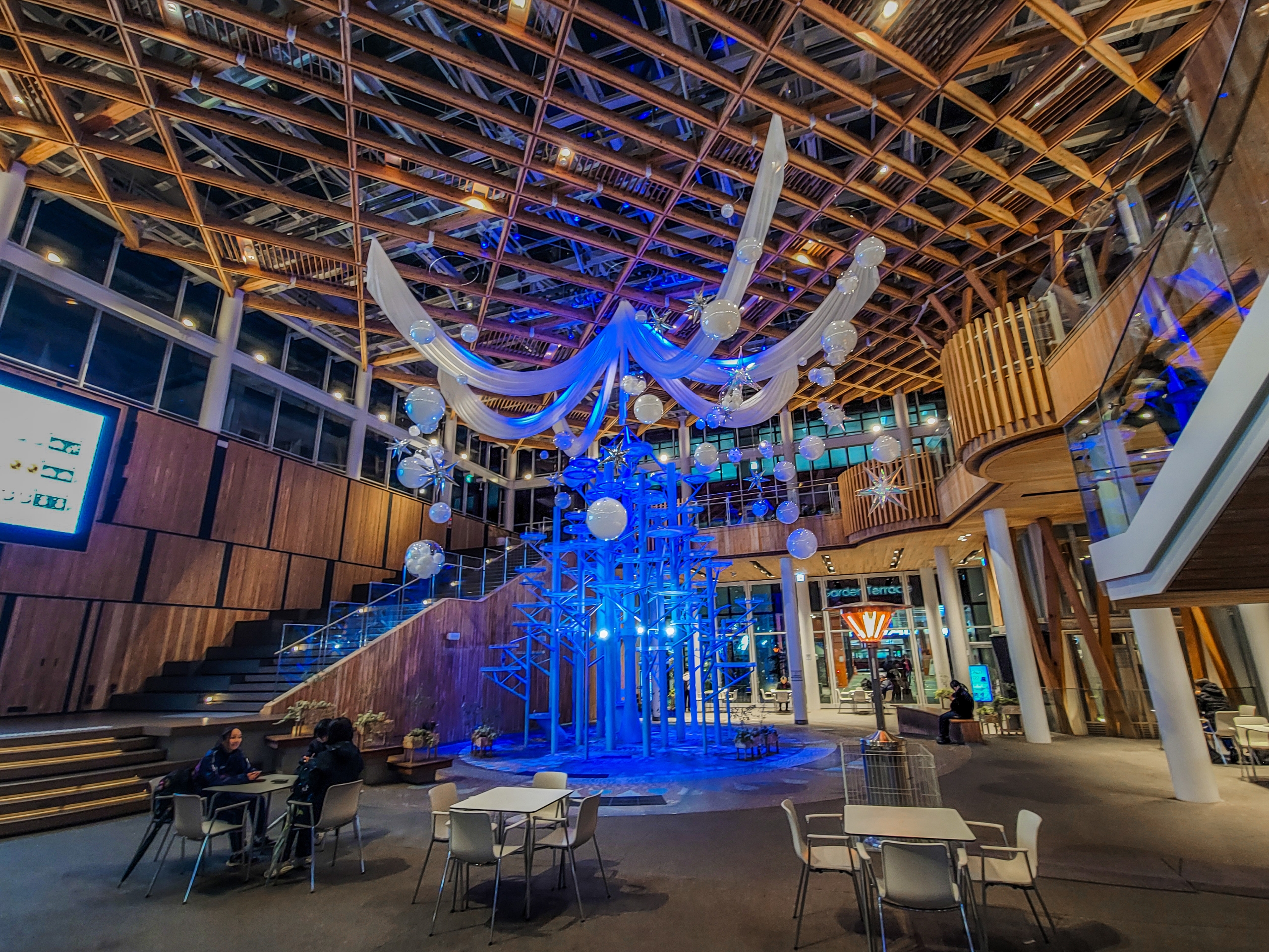 2018年7月にオープンした八戸まちなか広場 マチニワ。現代的で洗練されたデザイン。広すぎて暖房がおいつかないのか、いくつかの灯油ストーブが置かれていました。多くの学生が利用していて、おもにバスの時間調整のため広場で時間を潰していたような感じです。