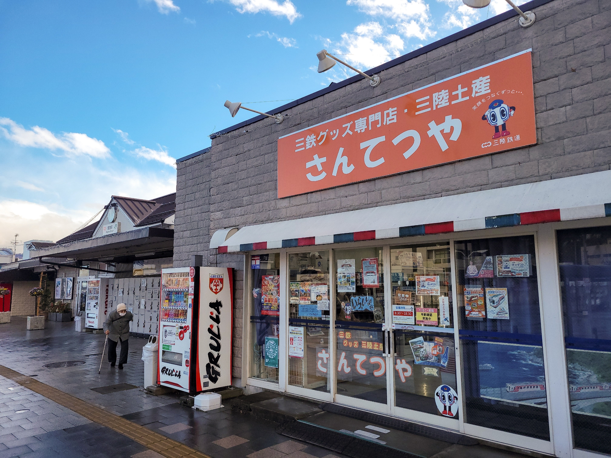 三陸鉄道直営の売店「さんてつや」。キヨスク、お土産屋、オフィシャルグッズショップを足して3で割ったようなお店です。あまり昼食になりそうなものはなかったので、駅前にセブンイレブンがあったので、そちらで購入。