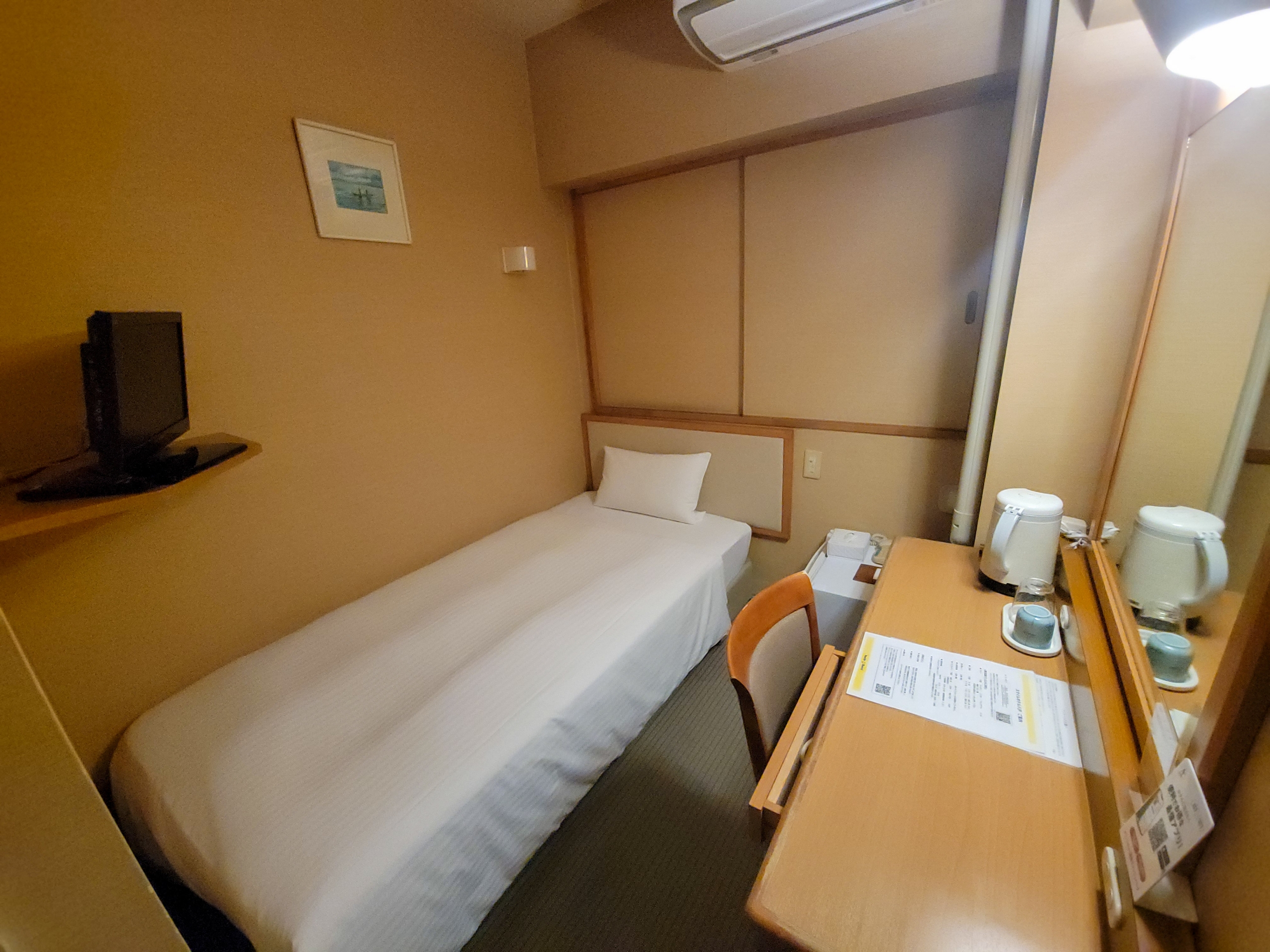 シンプルな部屋です。ユニットバスに湯をはって、夕食前に冷えた体を温めました。酔っぱらってそのまま寝ても大丈夫。
