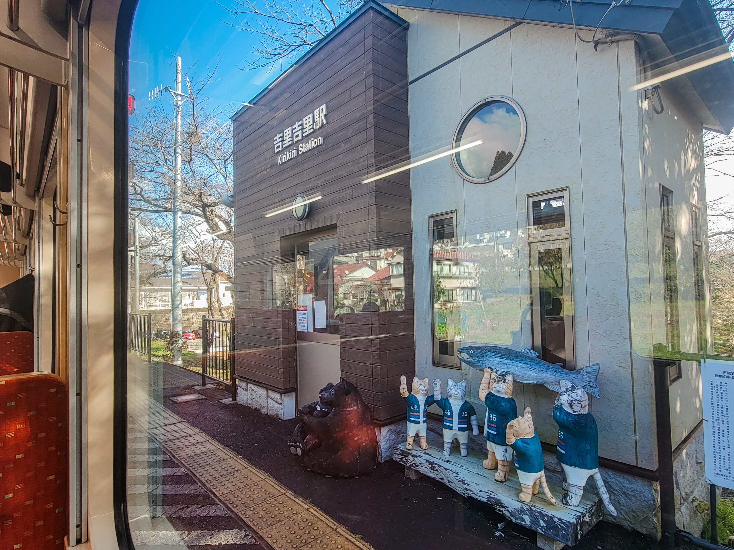 珍しい駅名前の吉里吉里駅。名前の由来は近くには吉里吉里海岸が、アイヌ語由来説:「キリキリ」がアイヌ語で「白い砂浜」を意味するというアイヌ語由来説、砂浜を歩くと「キリキリ」と音が鳴ることに由来する鳴き砂由来説とがあります。熊の親子と猫5匹がサケを担いだ木彫りの像が置いてありました。