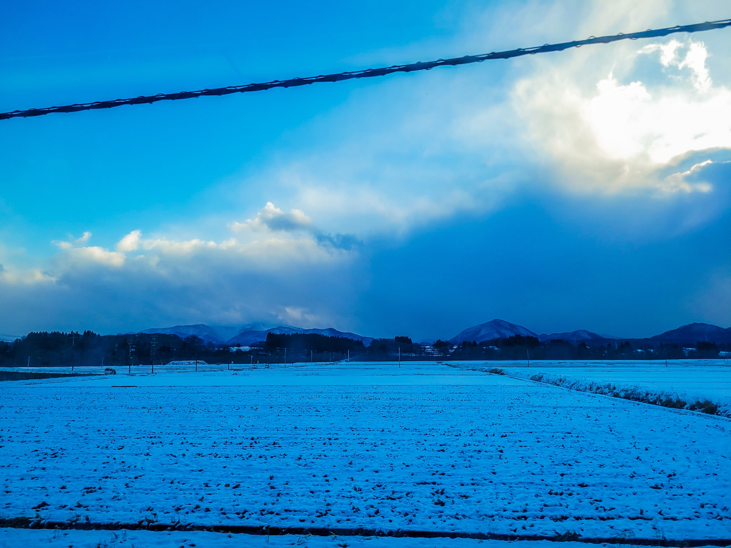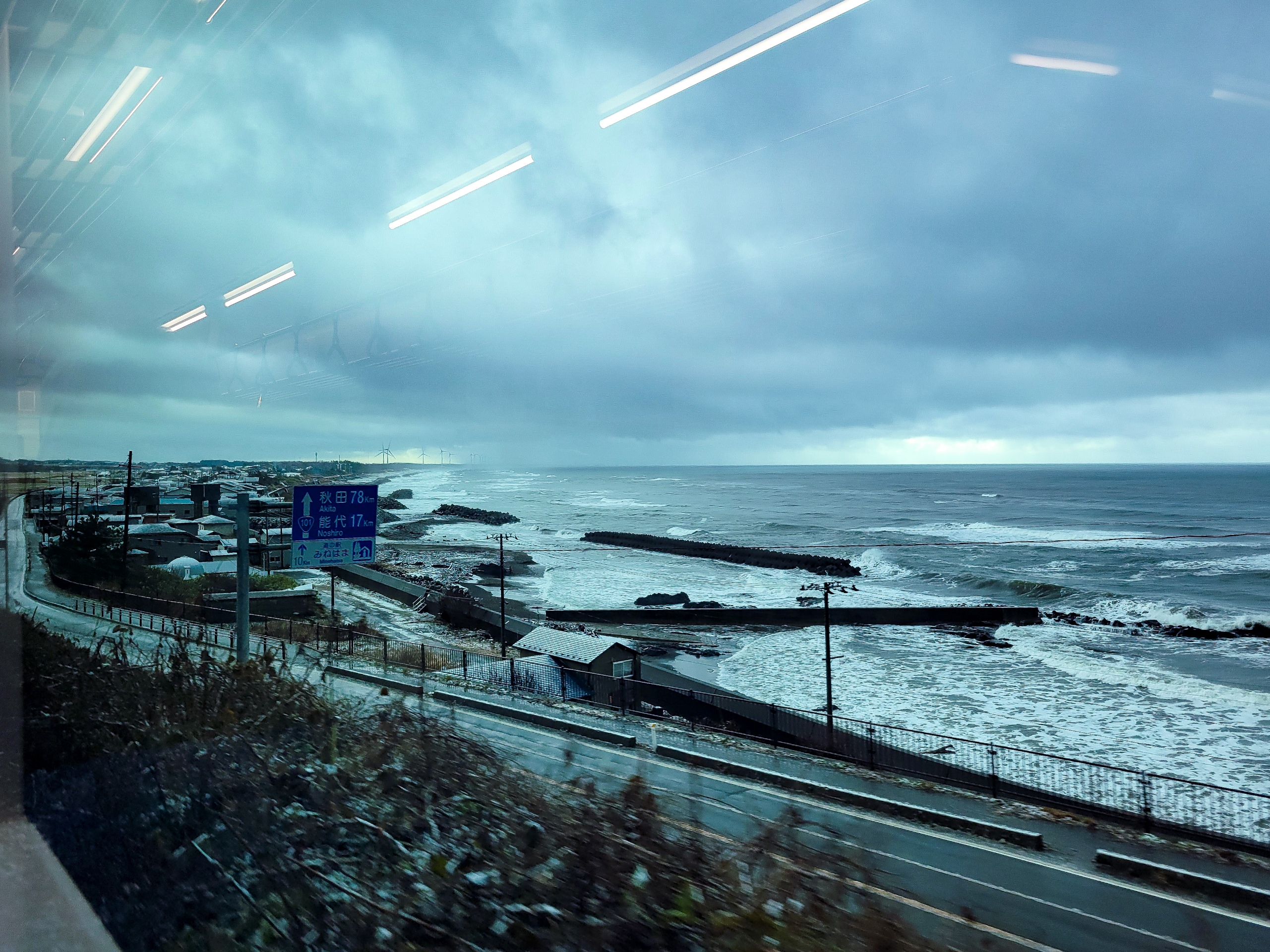 さんざん焦らされたが、列車は遅れて到着。車内は空いていて、座席は選び放題だった。この先も平野が広がり、日本海から遮るものがないので、列車が止まらないか心配だ。