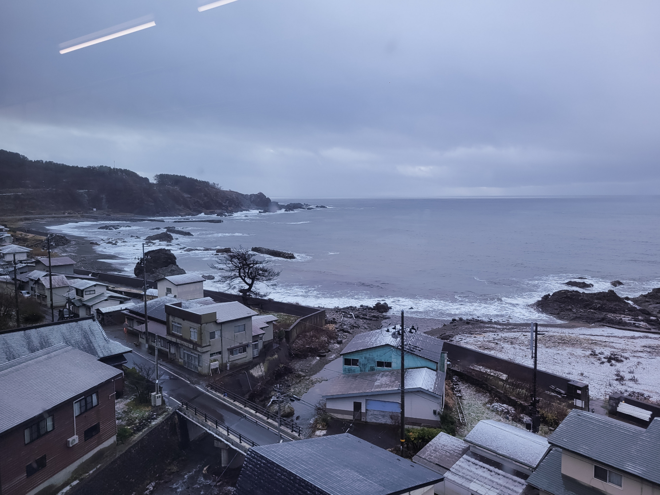 ウェスパ椿山駅からは、五能線・快速東能代行きに乗車。車窓はすっかり雪景色だ。昨日までとはうってかわって、一面銀世界が広がっている。不老ふ死温泉からは、7人ほどの宿泊客が利用していた。