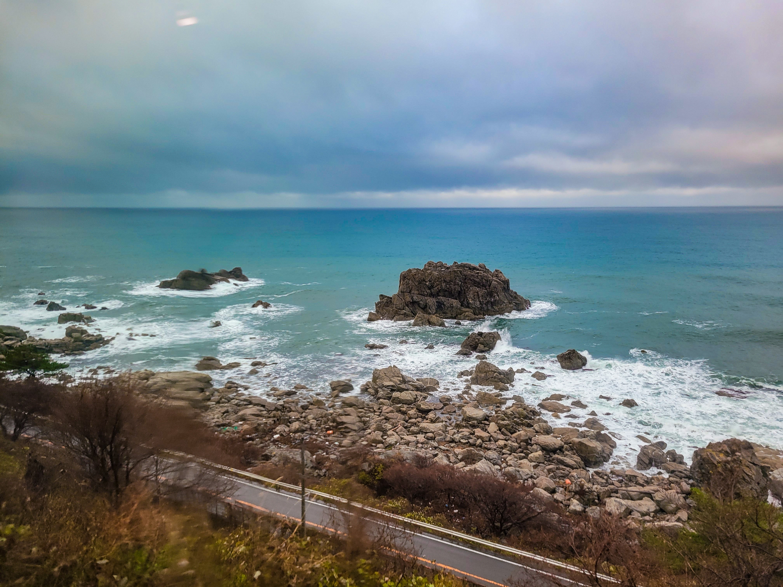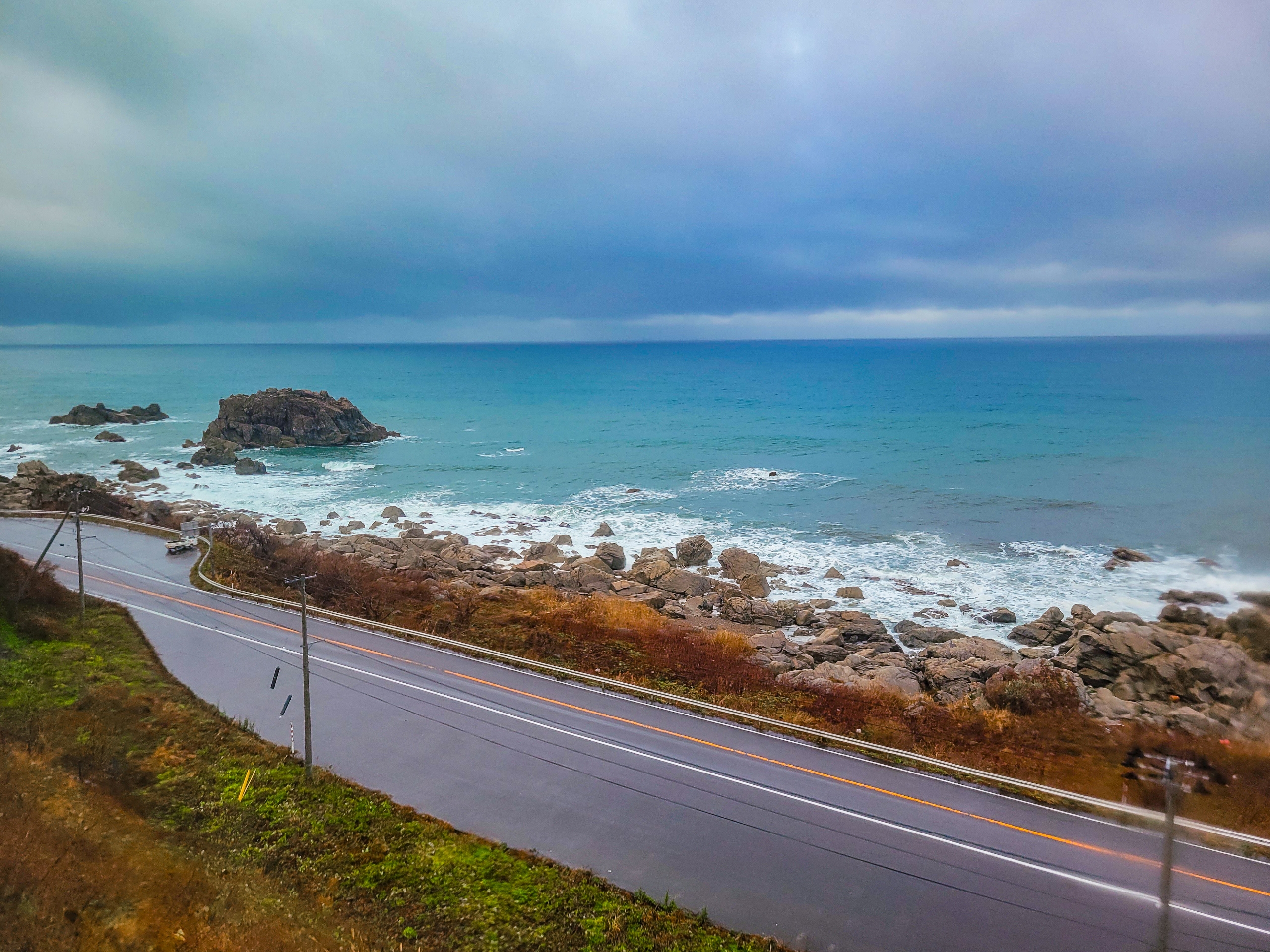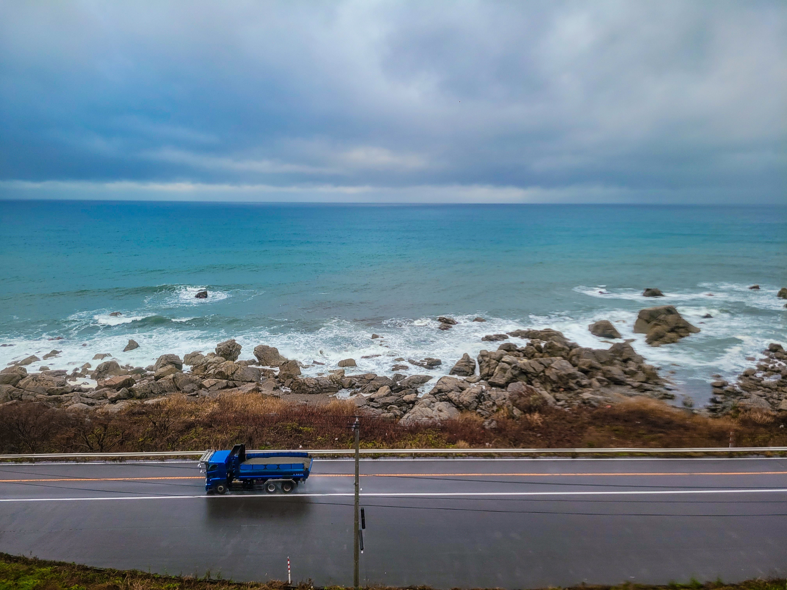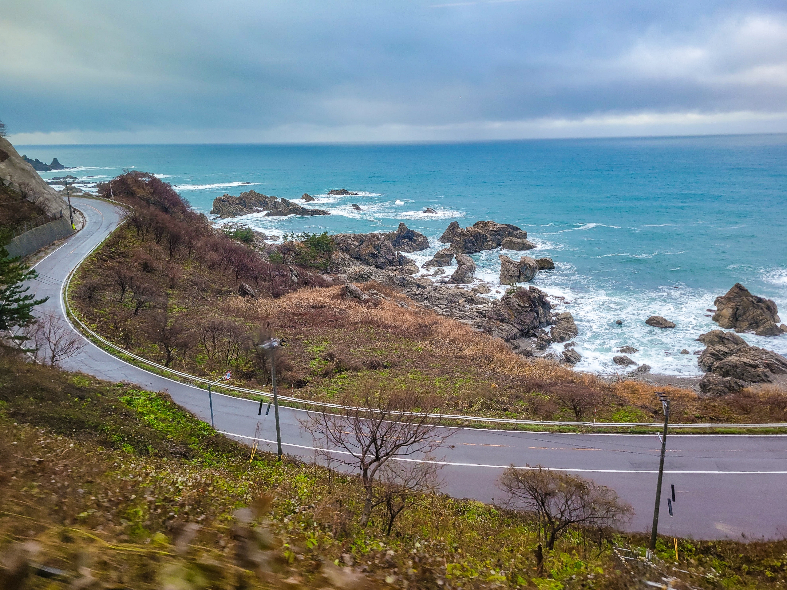 五能線といえば、やはりこの日本海を望む絶景区間。車窓からは、雄大な日本海の景色が広がる。リゾートしらかみ号だと徐行していた区間も、スピードを上げて通過する。少し高台を走るので、海の眺めは最高だ。天気が良ければ、もっと素晴らしい景色が楽しめたのだろう。