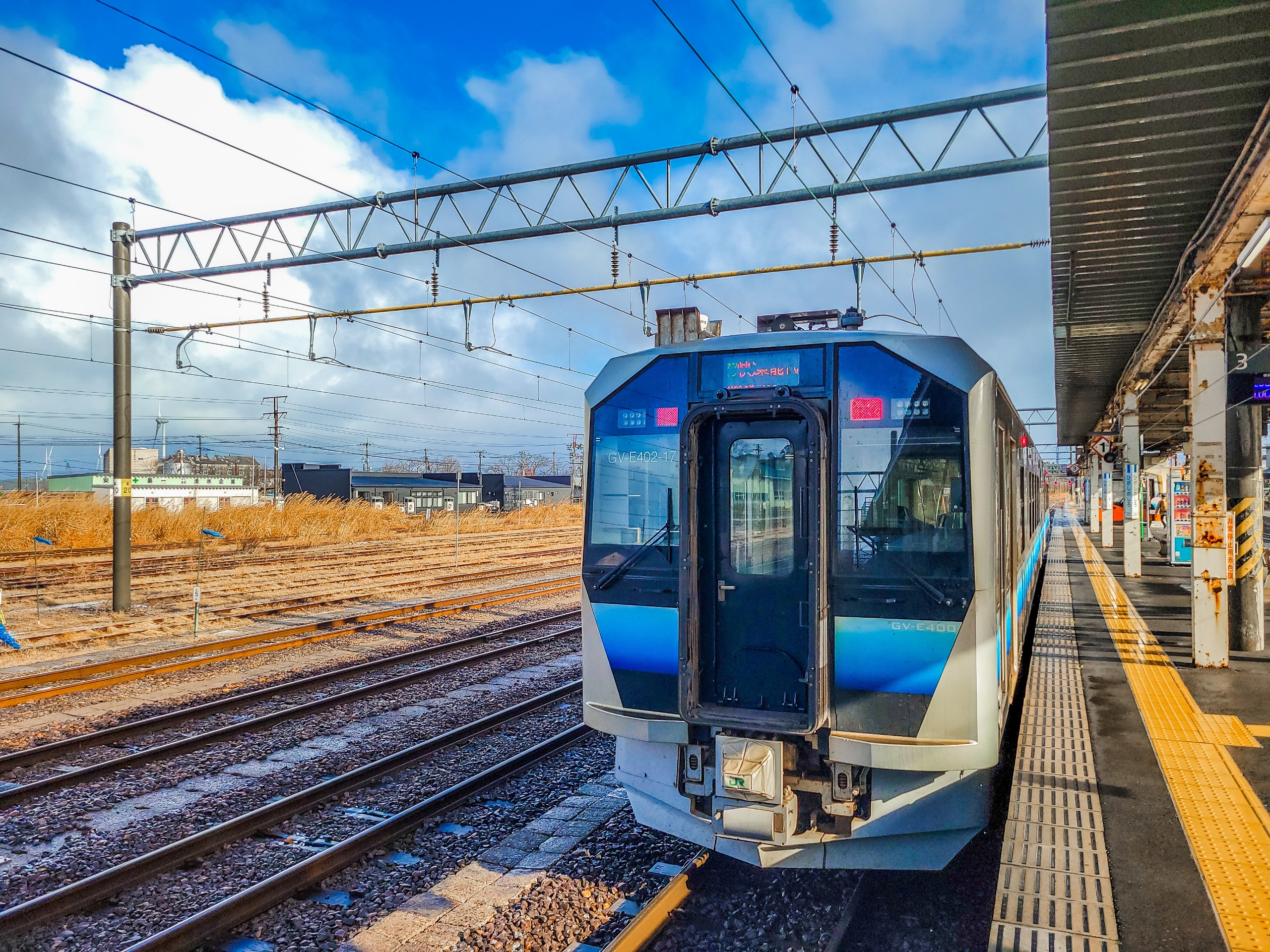 東能代駅に着くと、特急列車が強風の影響で止まっているというアナウンスがあった。えっ、マジか…。秋田方面からの列車も遅れているようで、この後の展開が読めなくなってきた。