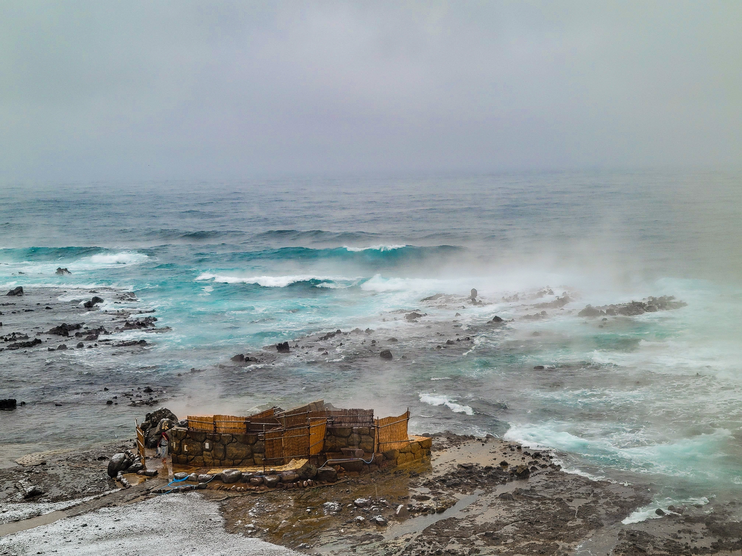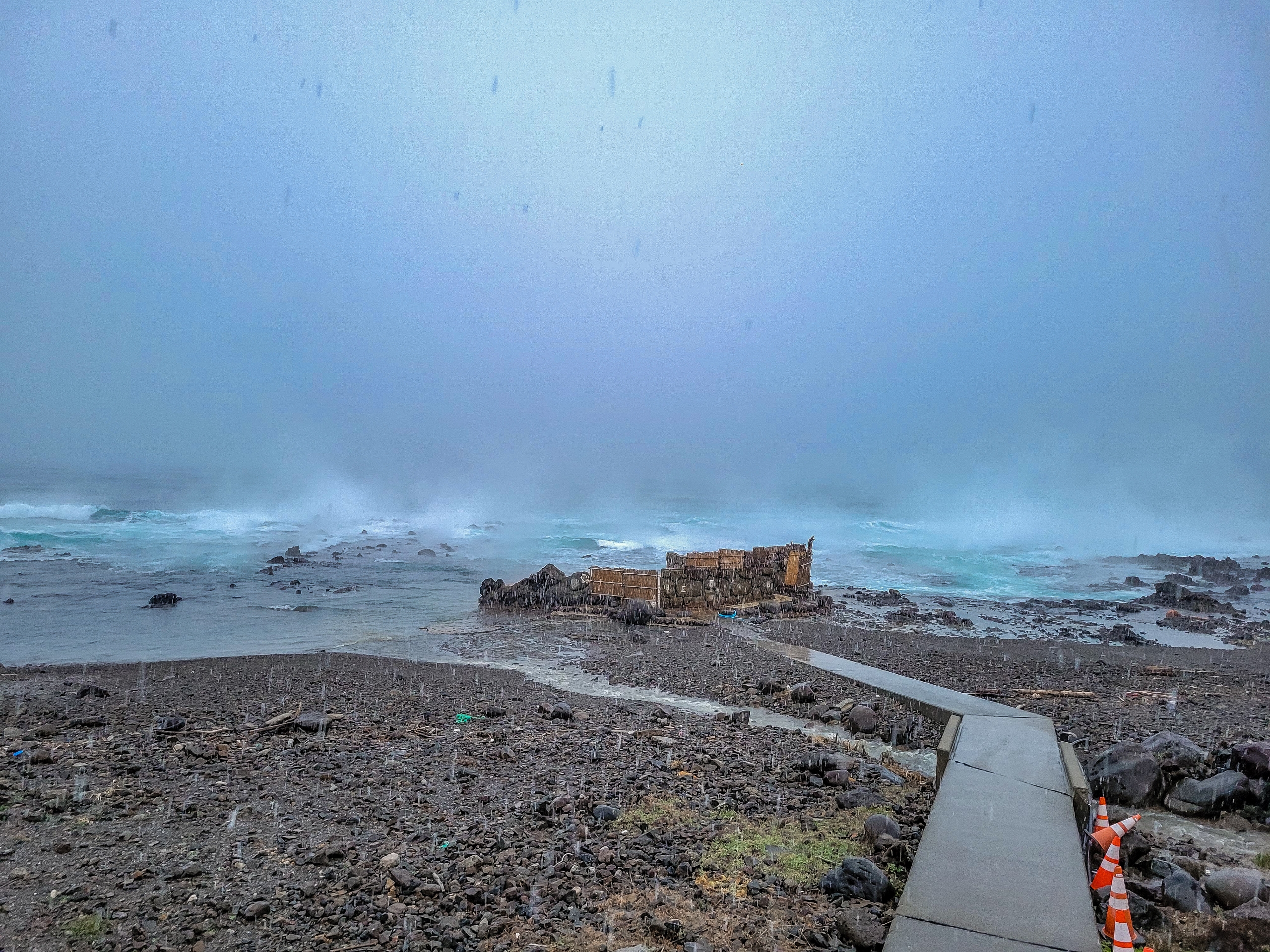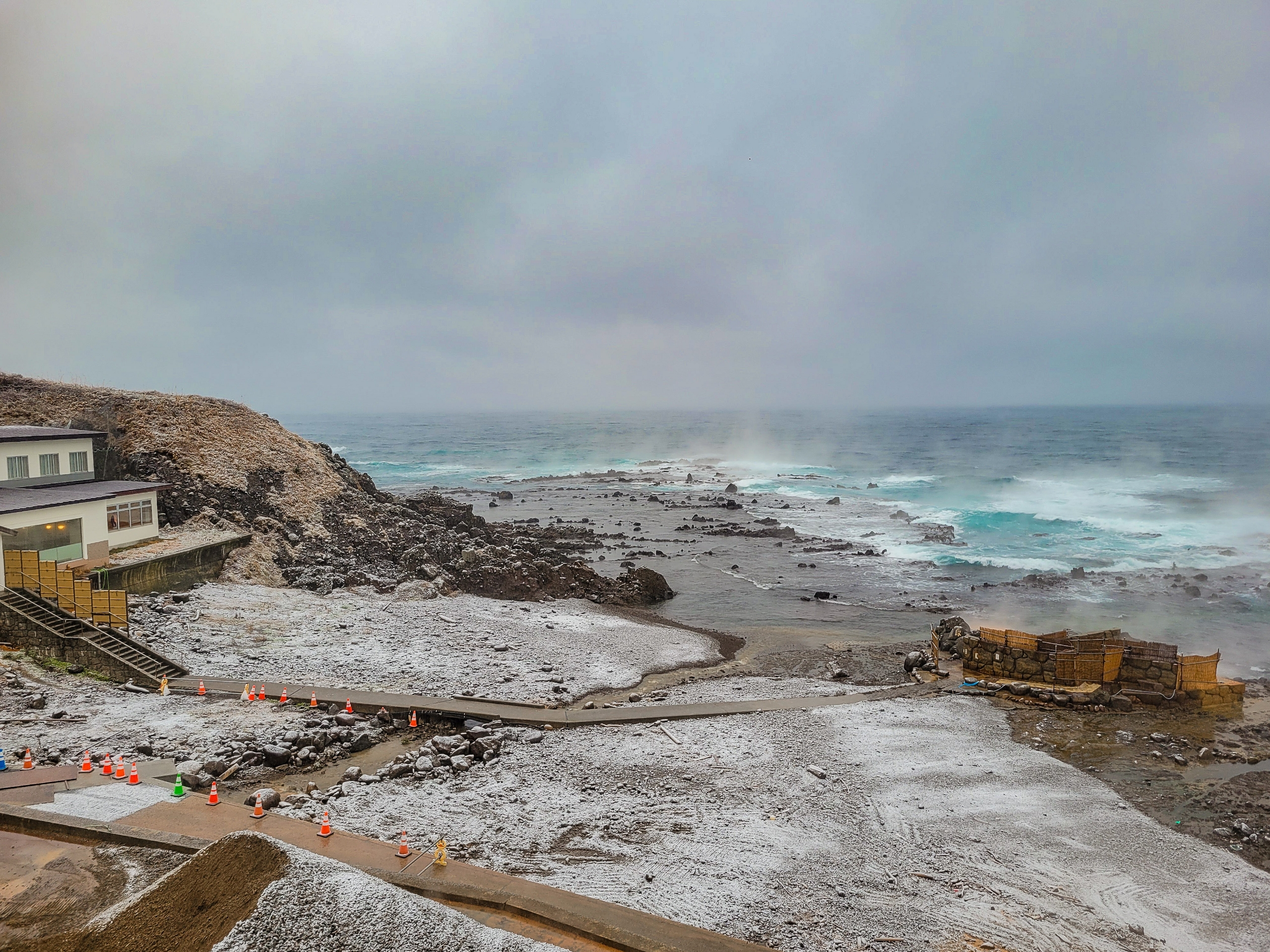 朝の混浴露天風呂へいってみる。目の前に広がるのは荒れ狂う冬の日本海。昨日とはうってかわって海は大荒れ。波が岩に打ち付け、白い飛沫を上げている。これぞ冬の日本海、といった光景だが、いかんせん寒すぎる。