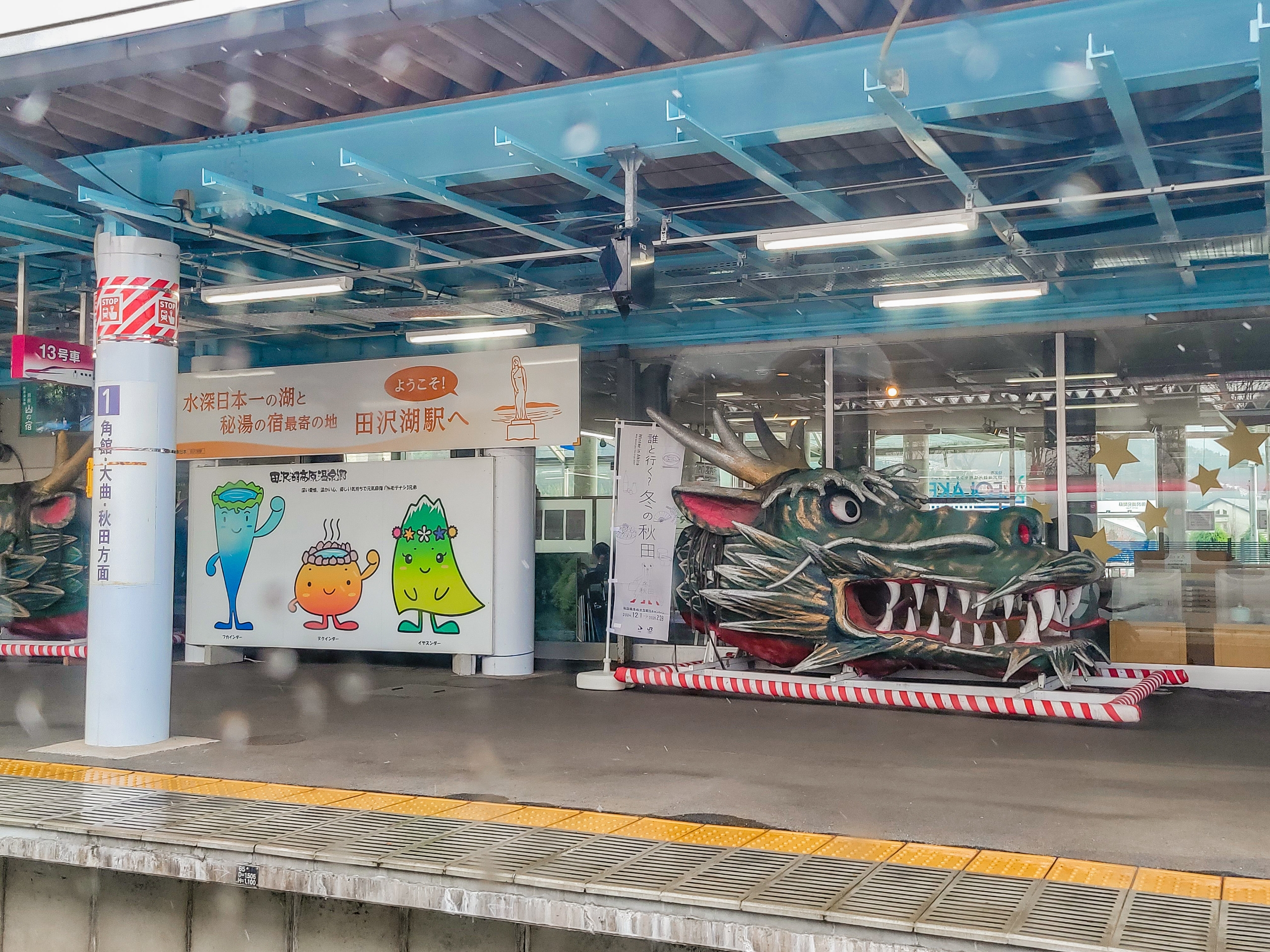 秘湯として人気のある乳頭温泉郷への玄関口、田沢湖駅を通過。ホームに飾ってあるのは、田沢湖に伝わる「たつこ姫伝説」に登場する龍をモチーフにしたものらしい。田沢湖は日本で最も深い湖で、水深は423.4mもある。いつか乳頭温泉にも行ってみたいな。