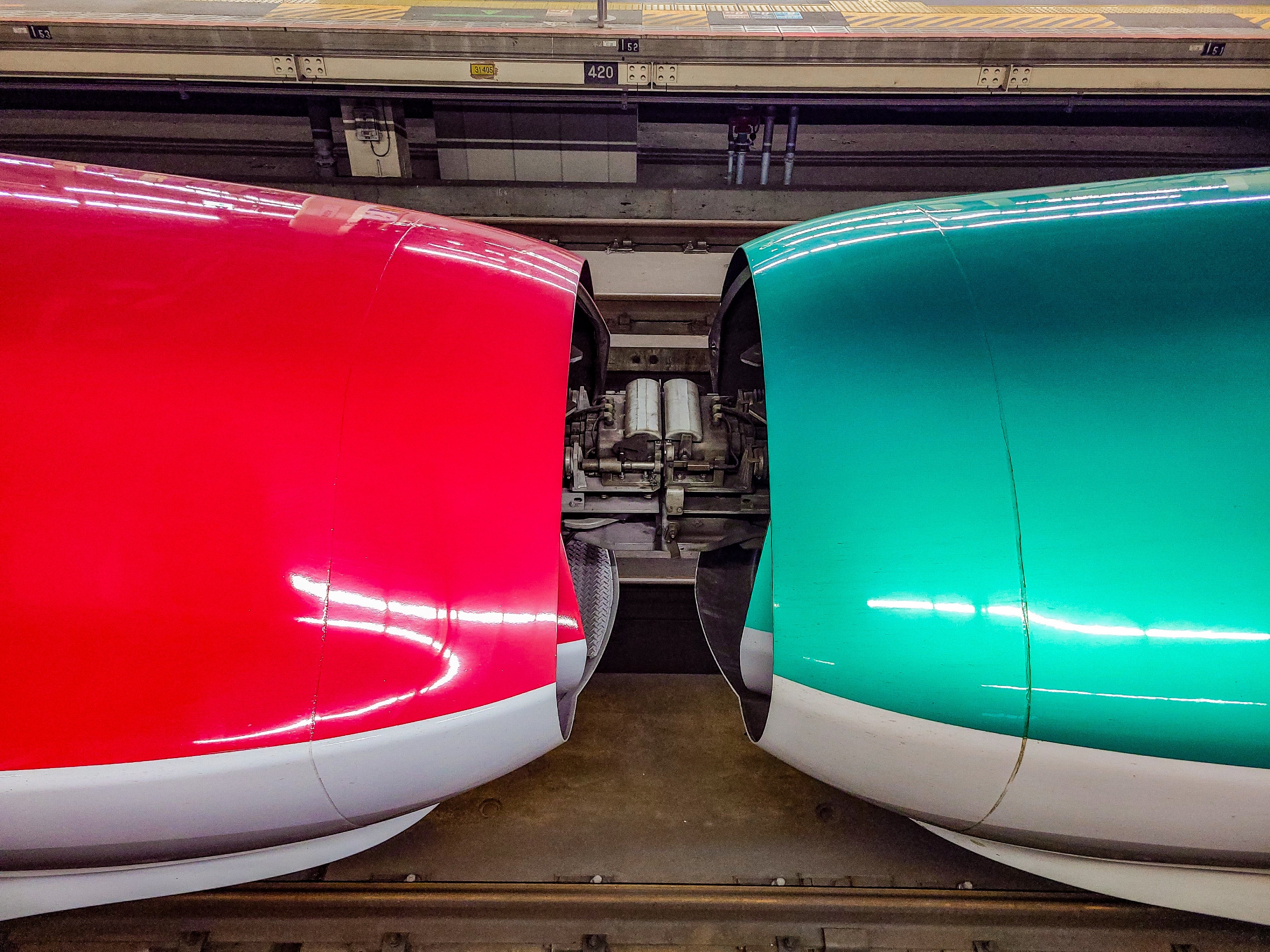 「こまち」のデザインは、フェラーリなどのカーデザイナーとして知られる奥山清行氏が監修。流線形のフォルムは、高速走行時の空気抵抗を低減し、快適な乗り心地を実現している。流麗なるフォルムは美しい。これが国内最高320km/hで走ると思うと、ワクワクしてくる。