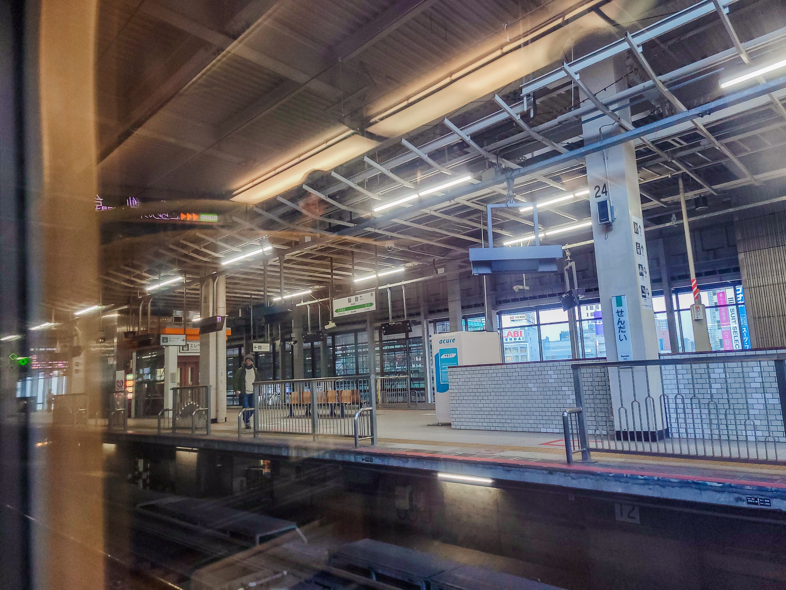 特急つがる42号秋田行きに乗車。運行が再開したということでホームに出て特急列車を待っていたが、また一つ手前の駅で強風のため列車が停止したという。おいおい、またかよ…。その後、案内もなくしばらくホームの上で待つことになった。