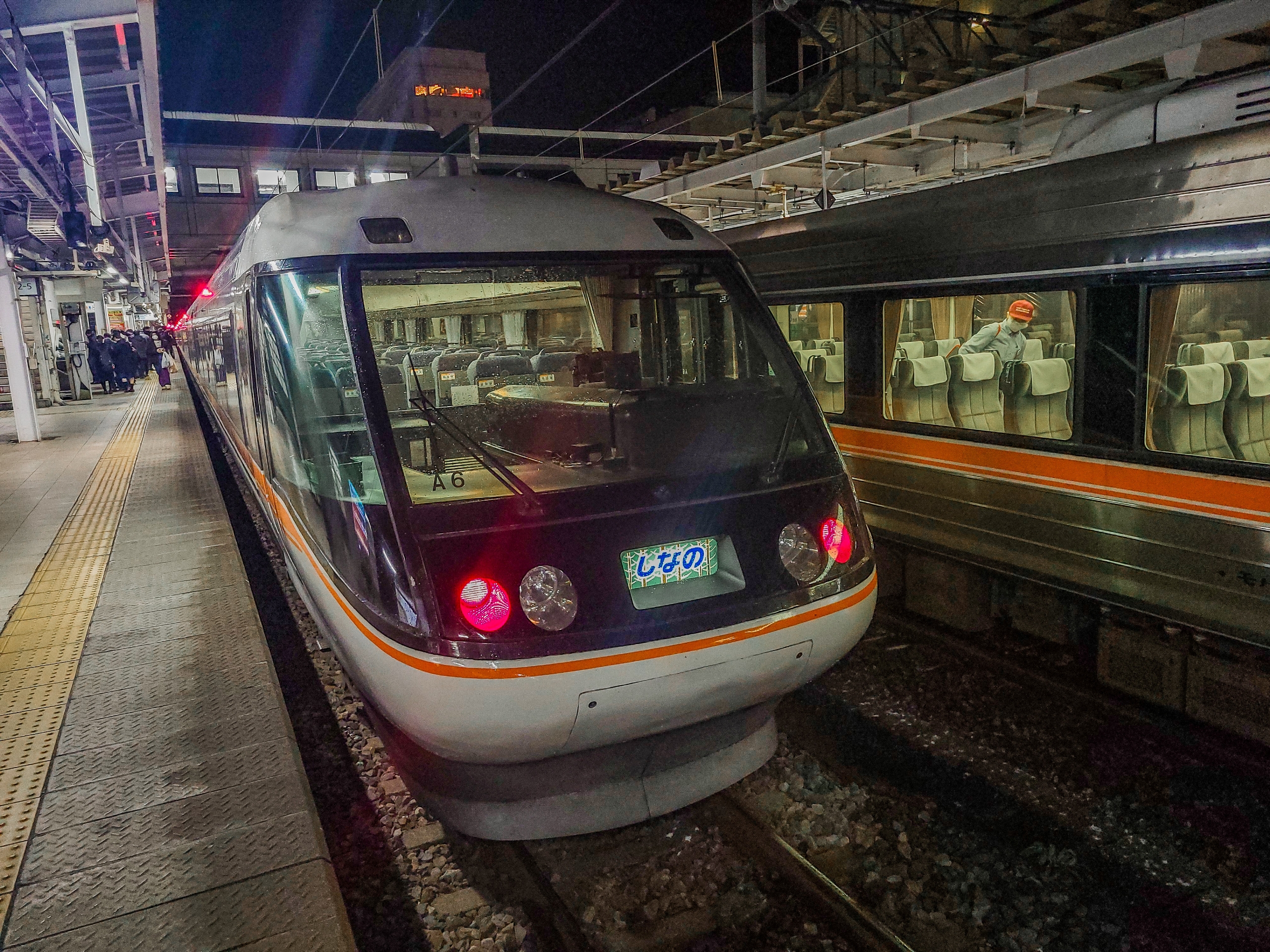 すでに名古屋駅行きのしなの号がホームで待っていたが、自由席車両の窓側はすべて埋まっていた。長野駅から仕事帰りで松本駅へ向かう人がとても多いようだ。