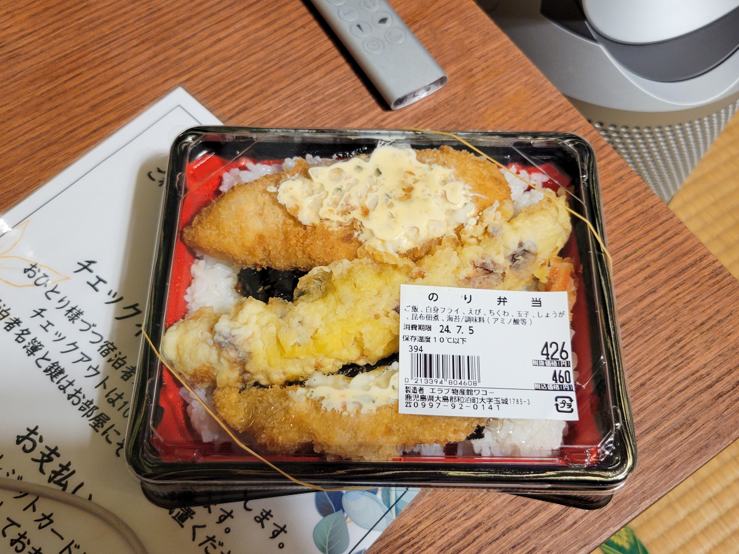 昨日買っておいたのり弁当。定番の白身魚のフライ、ちくわ天以外に、エビフライも入ってて、豪華のり弁。