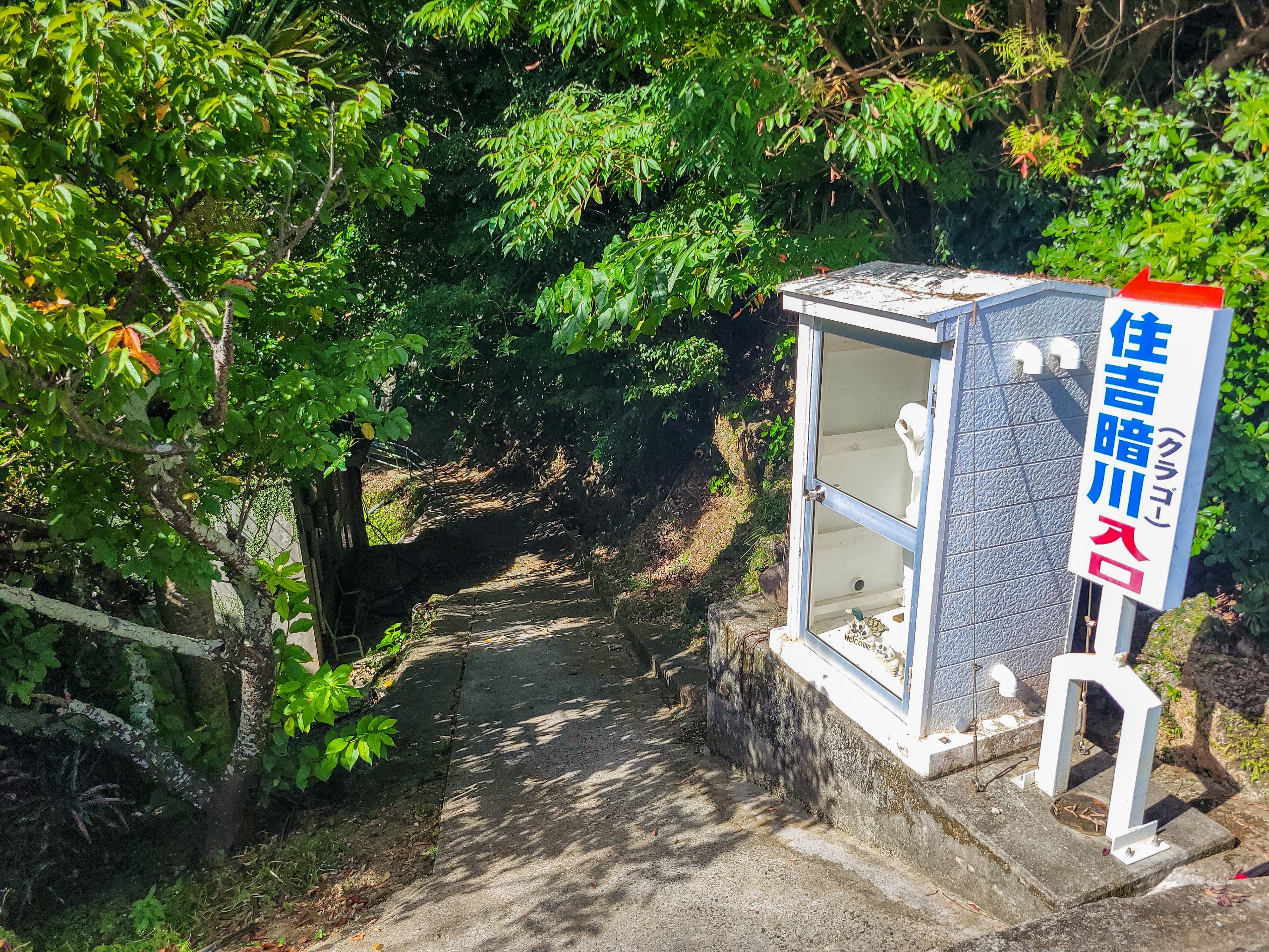 住吉暗川の入り口は、住吉集落の中にあり、近くを主要な道路がとおっているので、こんな場所に大きな暗川(洞窟)があるのかと驚かされます。上水道が整備されるまで、水源は生活するのにかかせないものなので、暗川を中心に集落ができたのかもしれませんね。後に調べたら、まさにその通りでした。