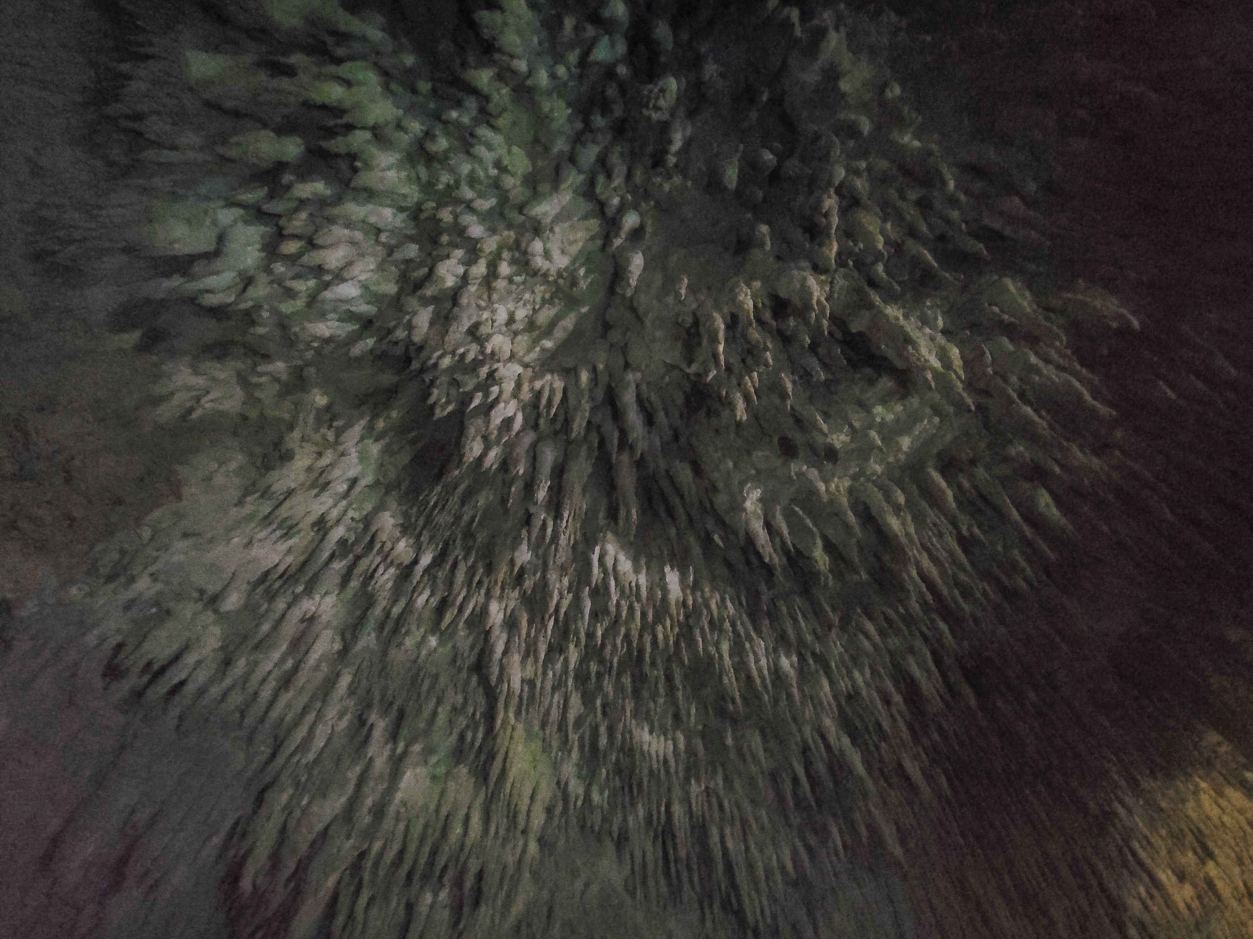 天井を見上げると土が突き刺さってくるような迫力があって、面白い光景です。天井から滴る水に含まれる石灰が作りだしたものです。