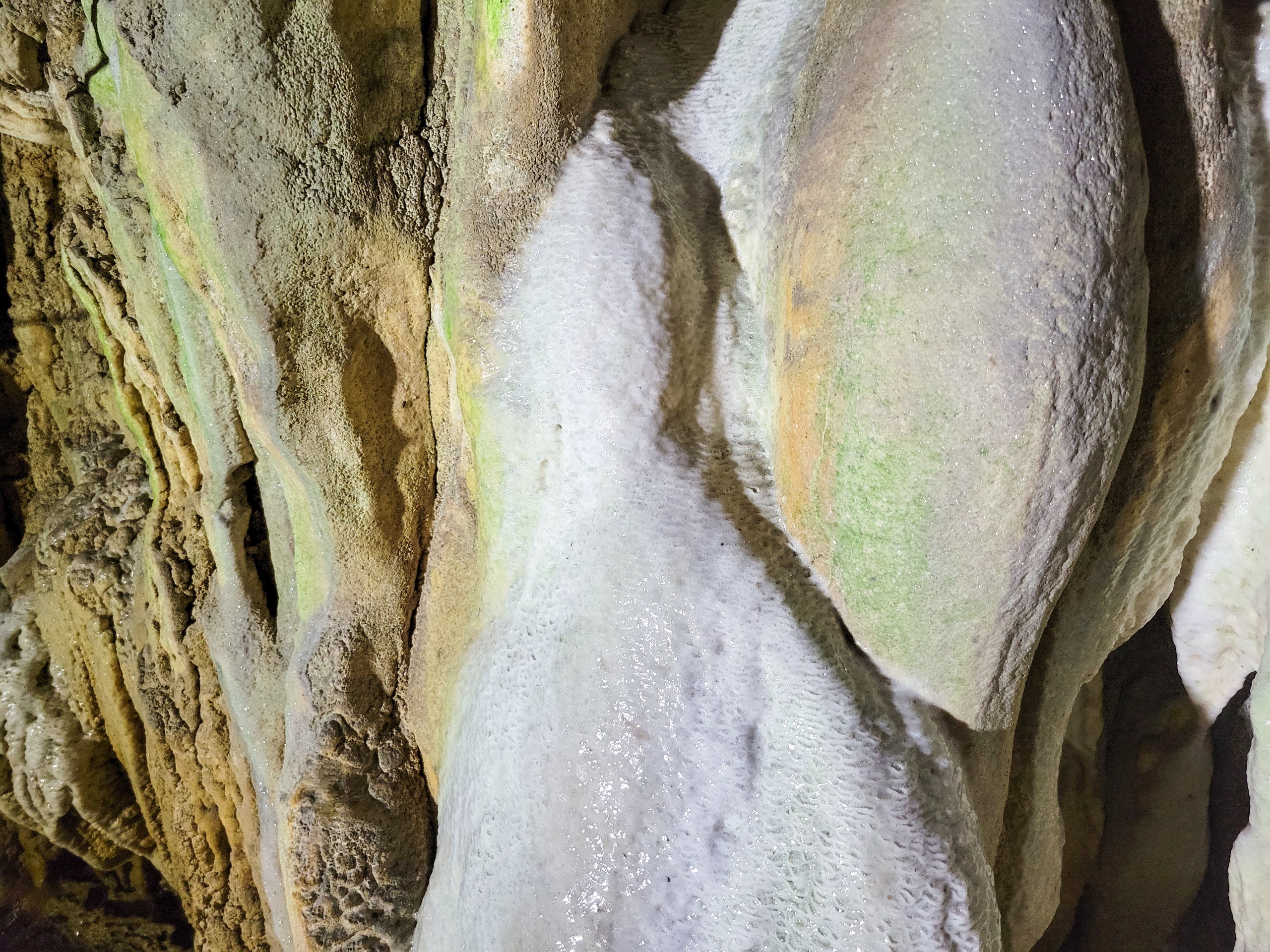 ライトにあたって鍾乳石ぐキラキラと輝いています。このような白い鍾乳石は今まで鍾乳洞ではみたことがありません(そんなに数はいってないけど)。どちらかといえば、温泉が噴出しているようなところで見かける光景です。