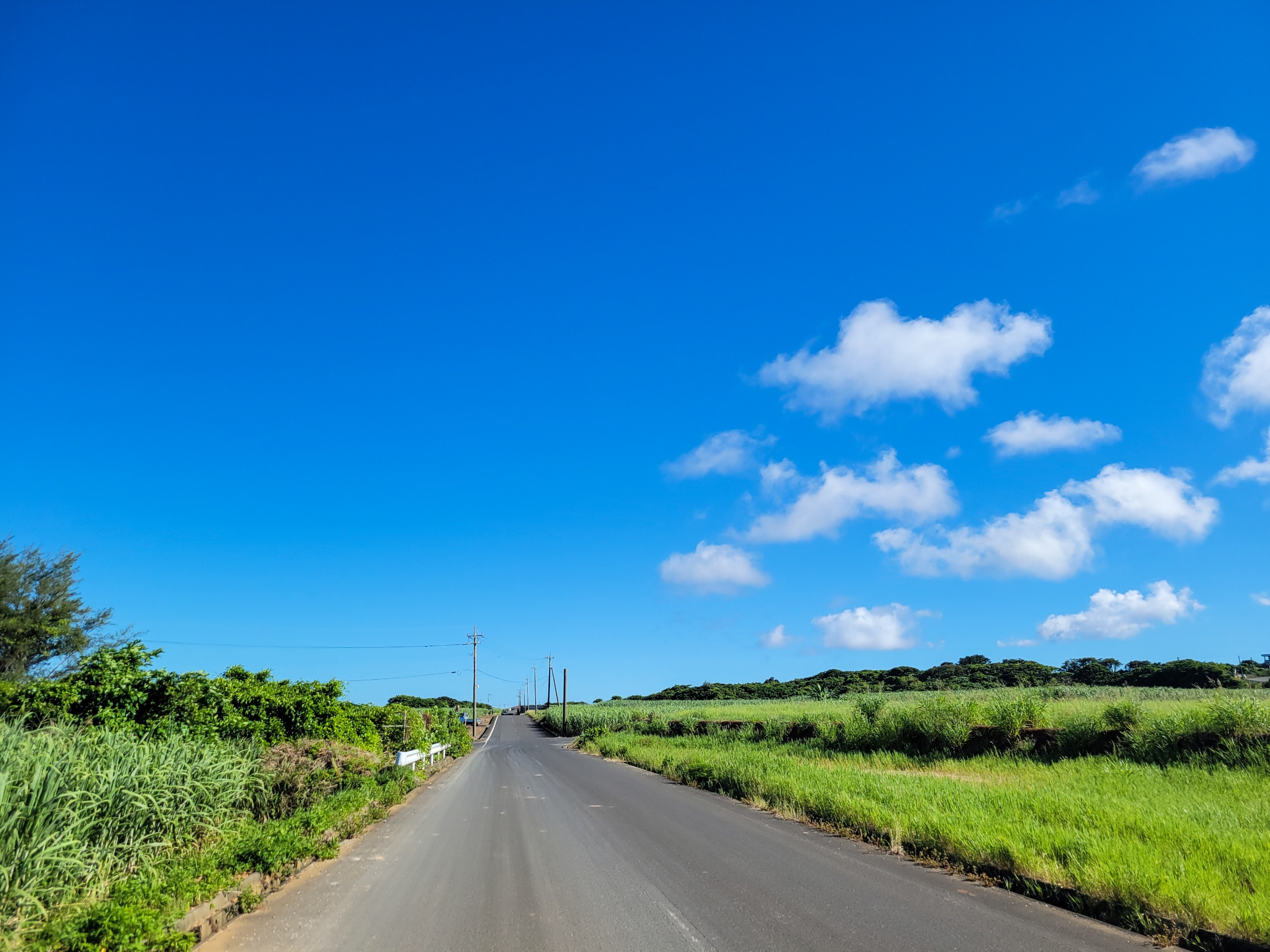 鍾乳洞の営業開始時間にあわせて、少しゆっくりして7時過ぎに宿を出発したのですが、すでに空は真っ青です。この時うっかりふくらはぎに日焼け止めを塗り忘れてて、後ろから照され続けて、やけど状態になってしまいました。