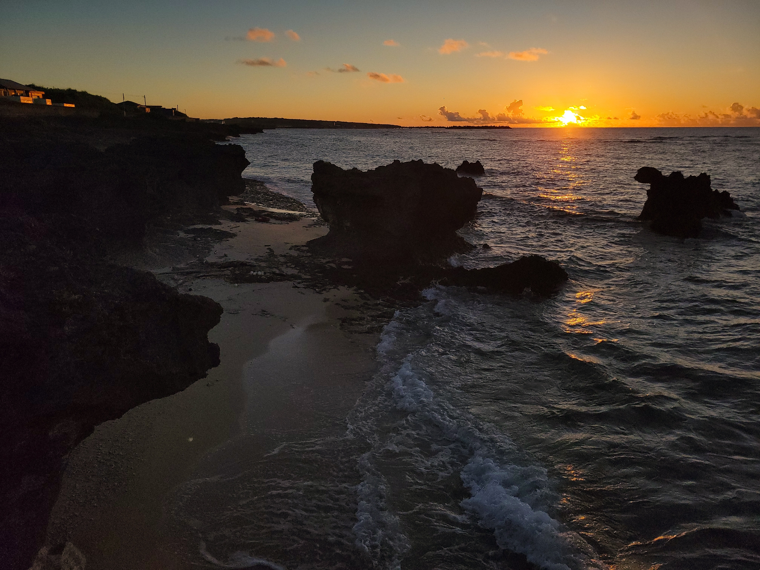 宿泊している和泊町の中心部は太平洋に面しているので、布団のうえで、どこか朝日を見るのに良い場所はないかと探していると、良さそうな展望台っぽいところがあったのですが、実際に行ってみるとあまり眺めが良くなかったので、近くの堤防から海辺に降りて、朝日を眺めることにしました。