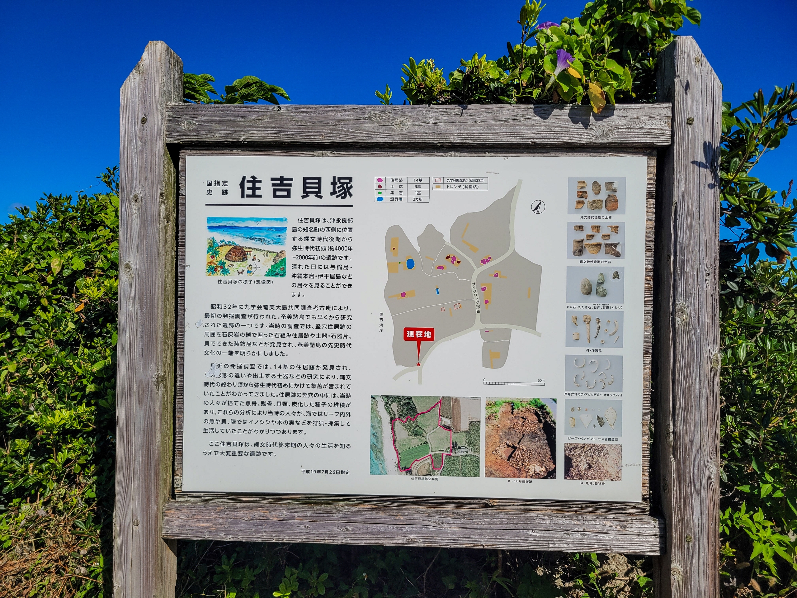 貝塚は先史時代の住民が食べていた貝類の捨て殻の遺跡。発掘調査が行われ、縄文時代後期~弥生時代初頭にかけて、14棟の住居の痕跡が見つかり、九州から持ち込まれた土器や石なども見つかったそうです。はるか昔から九州と交流があったとは驚きました。現在は遺跡保存のため、埋め戻されているので、看板がたっているのみです。