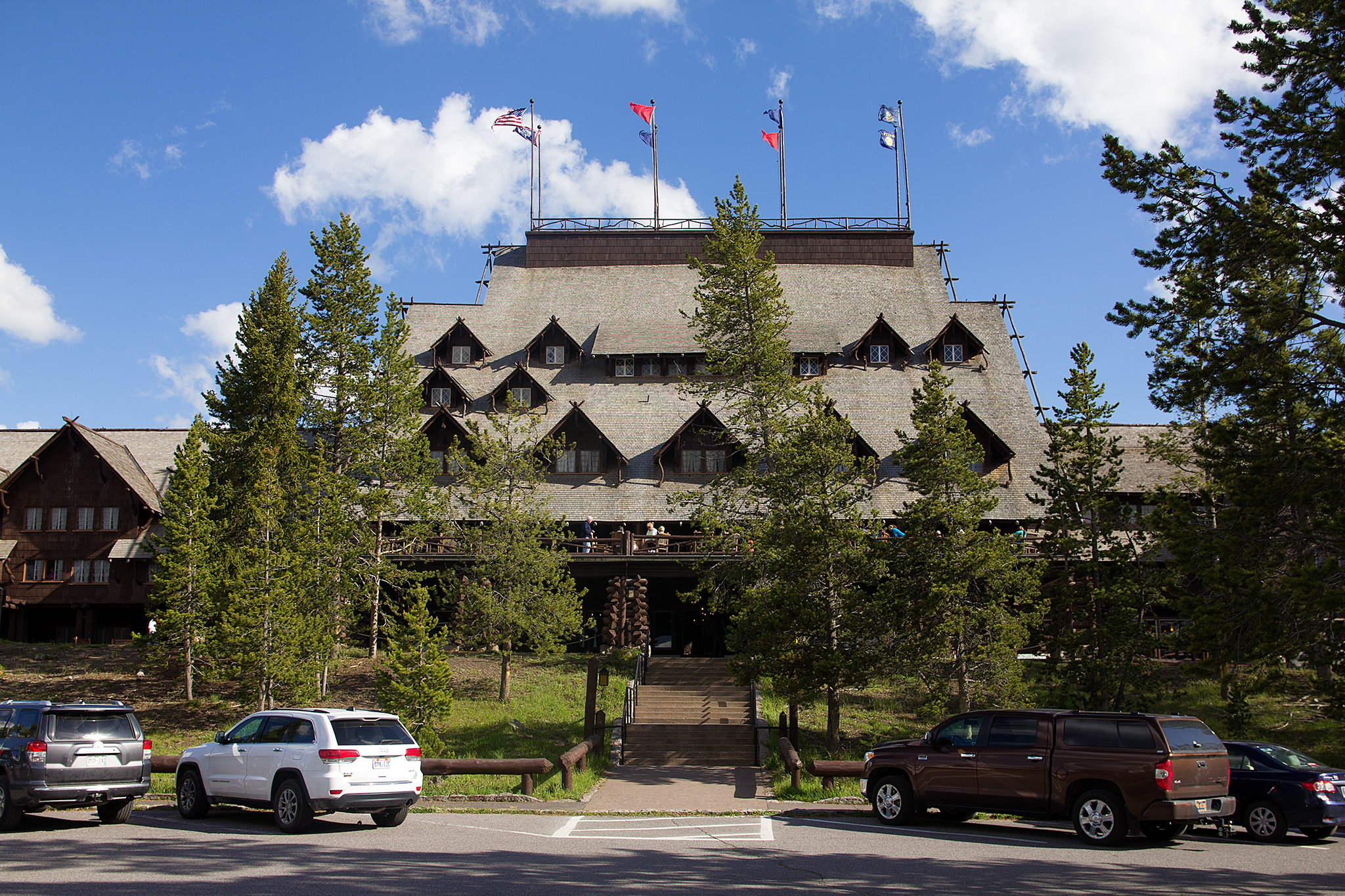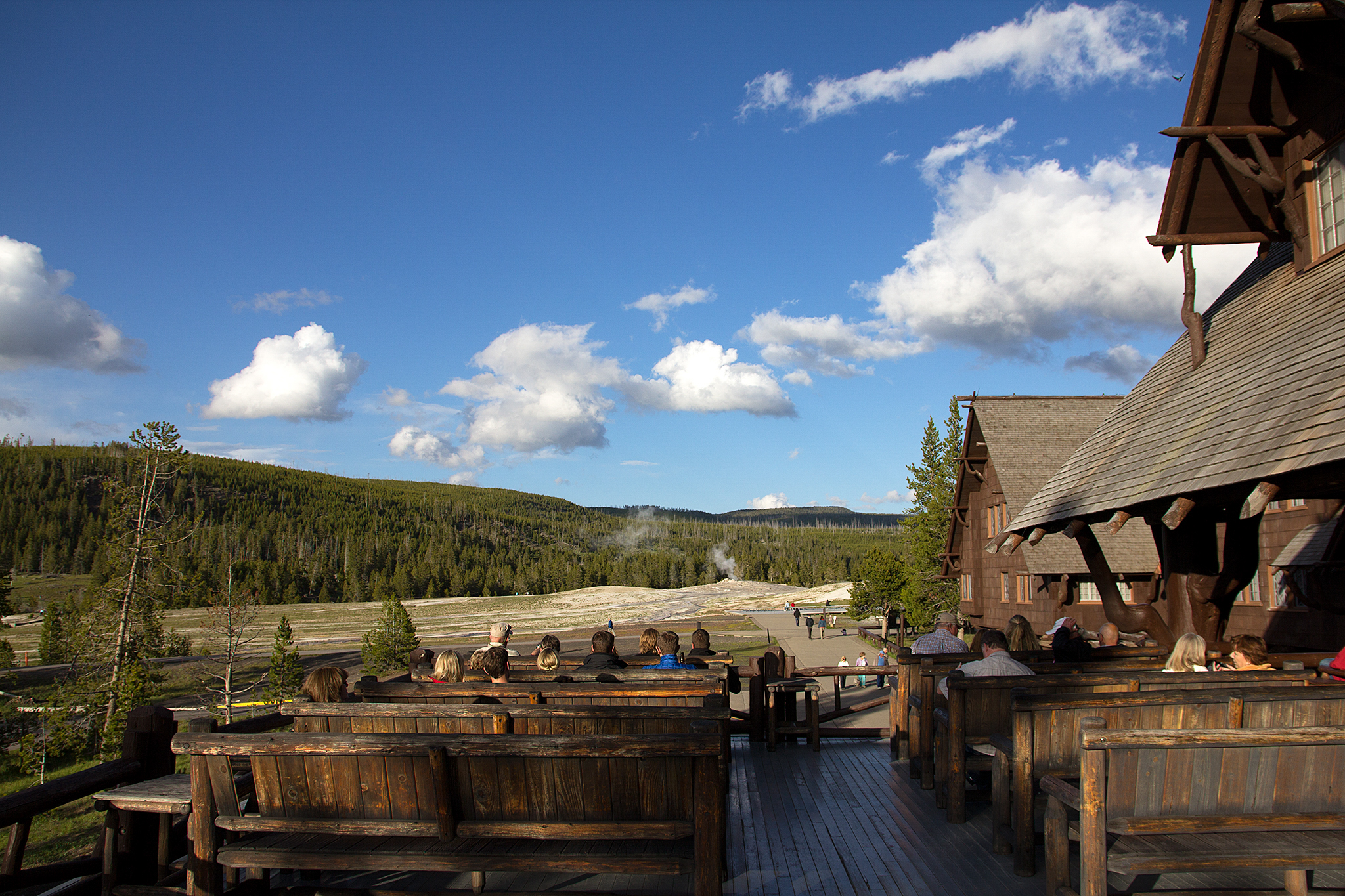 ホテル2階のテラスからもOld Faithful Geyserが見えるようですね。
