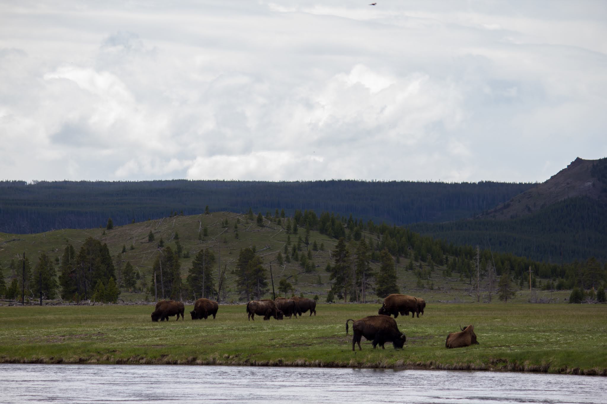 ファイヤーホール川の対岸にはバイソンの群れ。