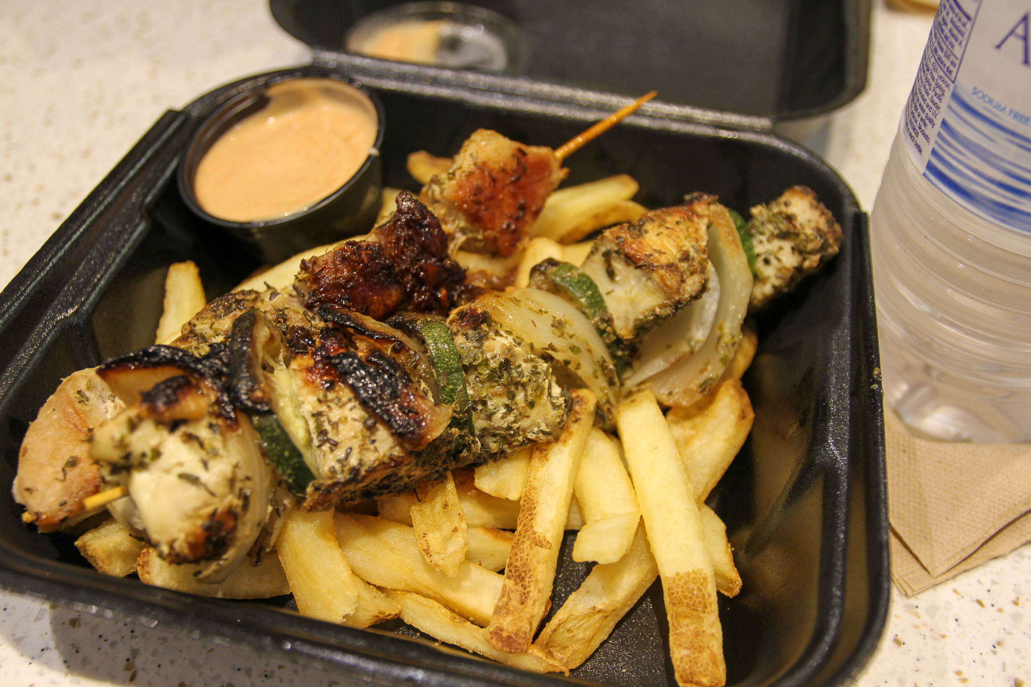 鶏と豚肉のスブラキ 9.45USD、ギリシャ料理です。
