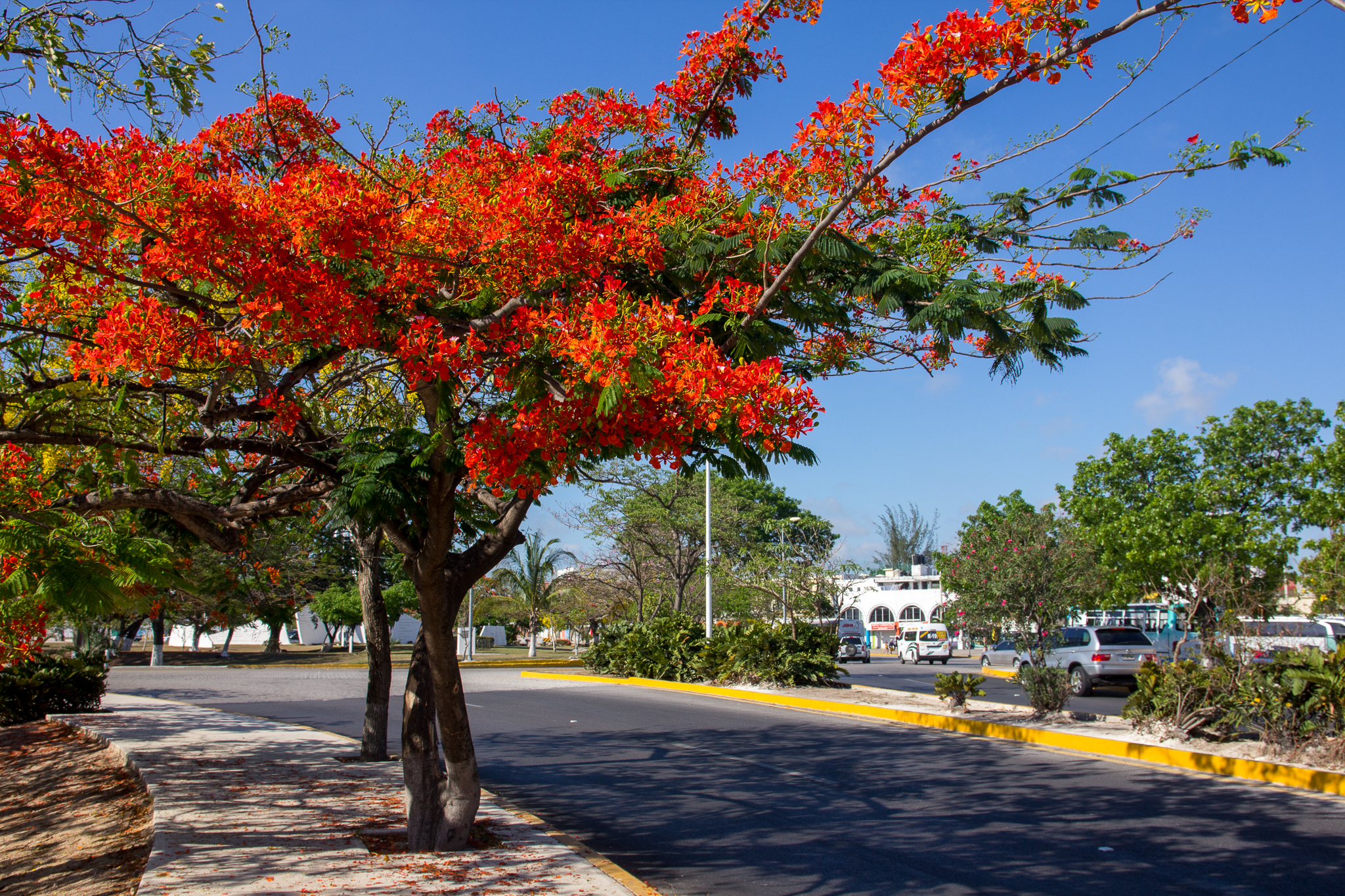 夏時期に咲くというフランボヤンという花が眩しいぐらいの朱色。