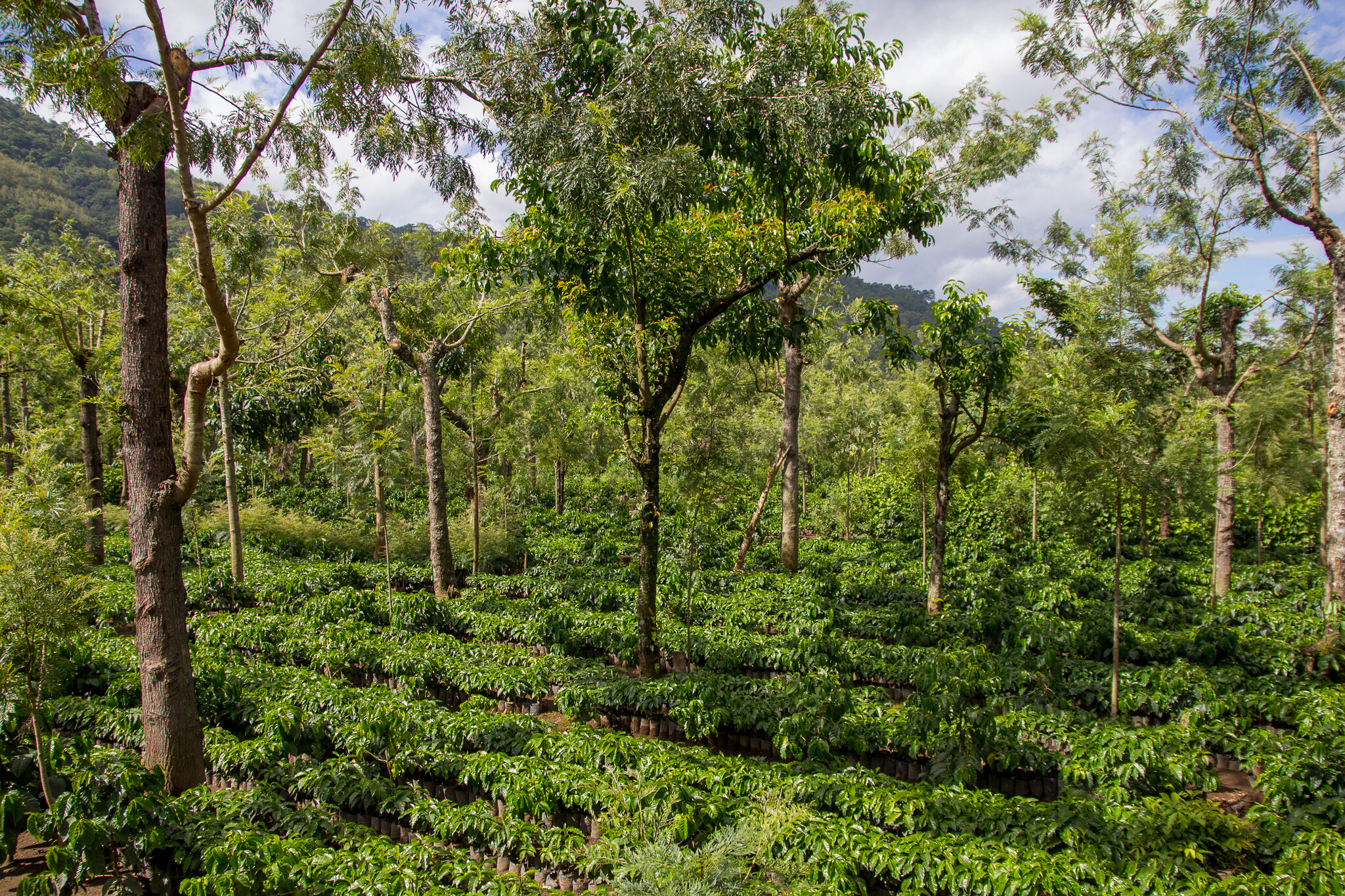 コーヒーの木は苗のポットによって、整列して植えられています。