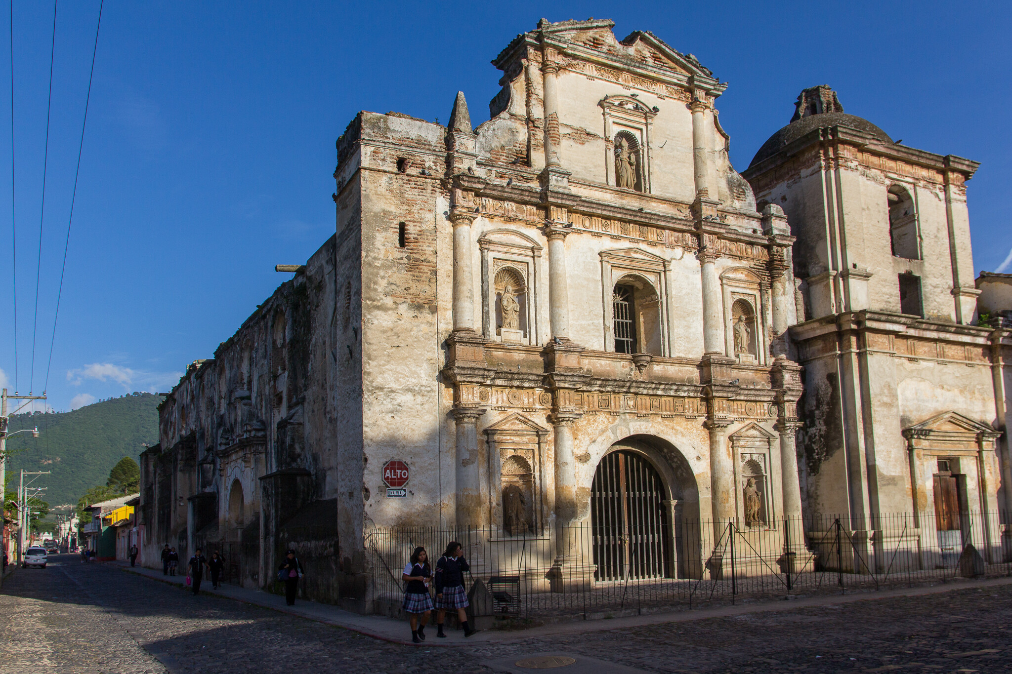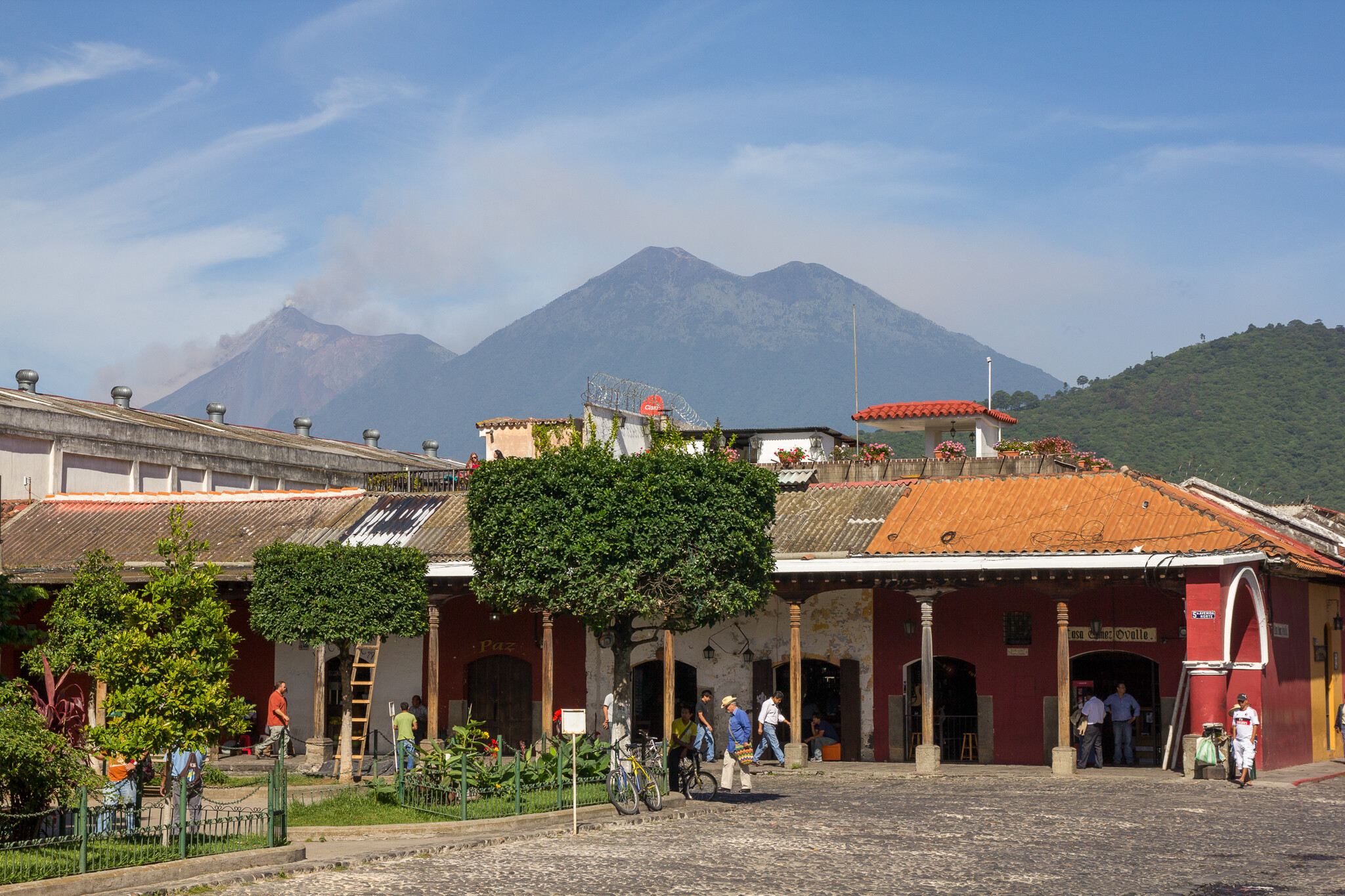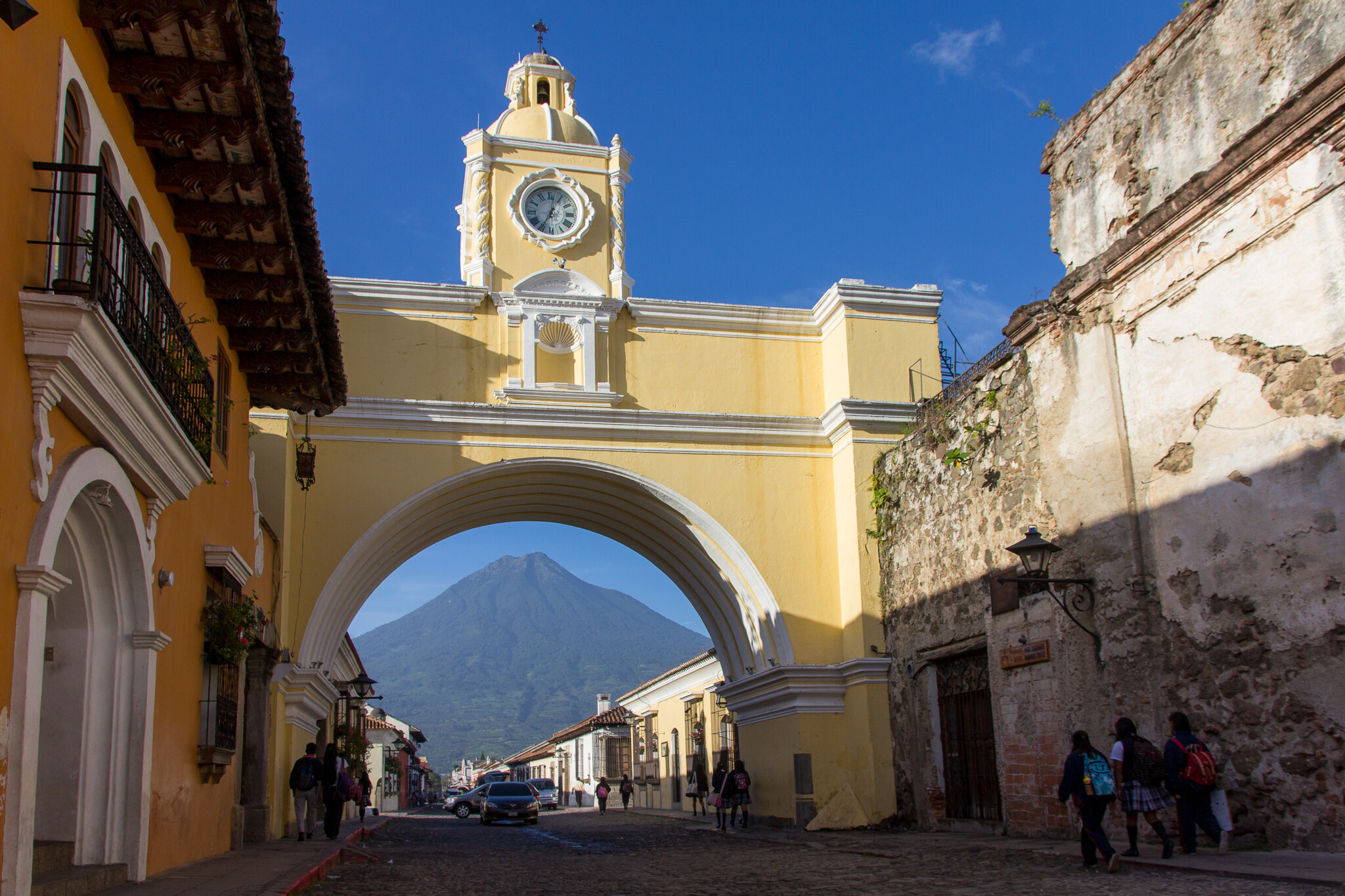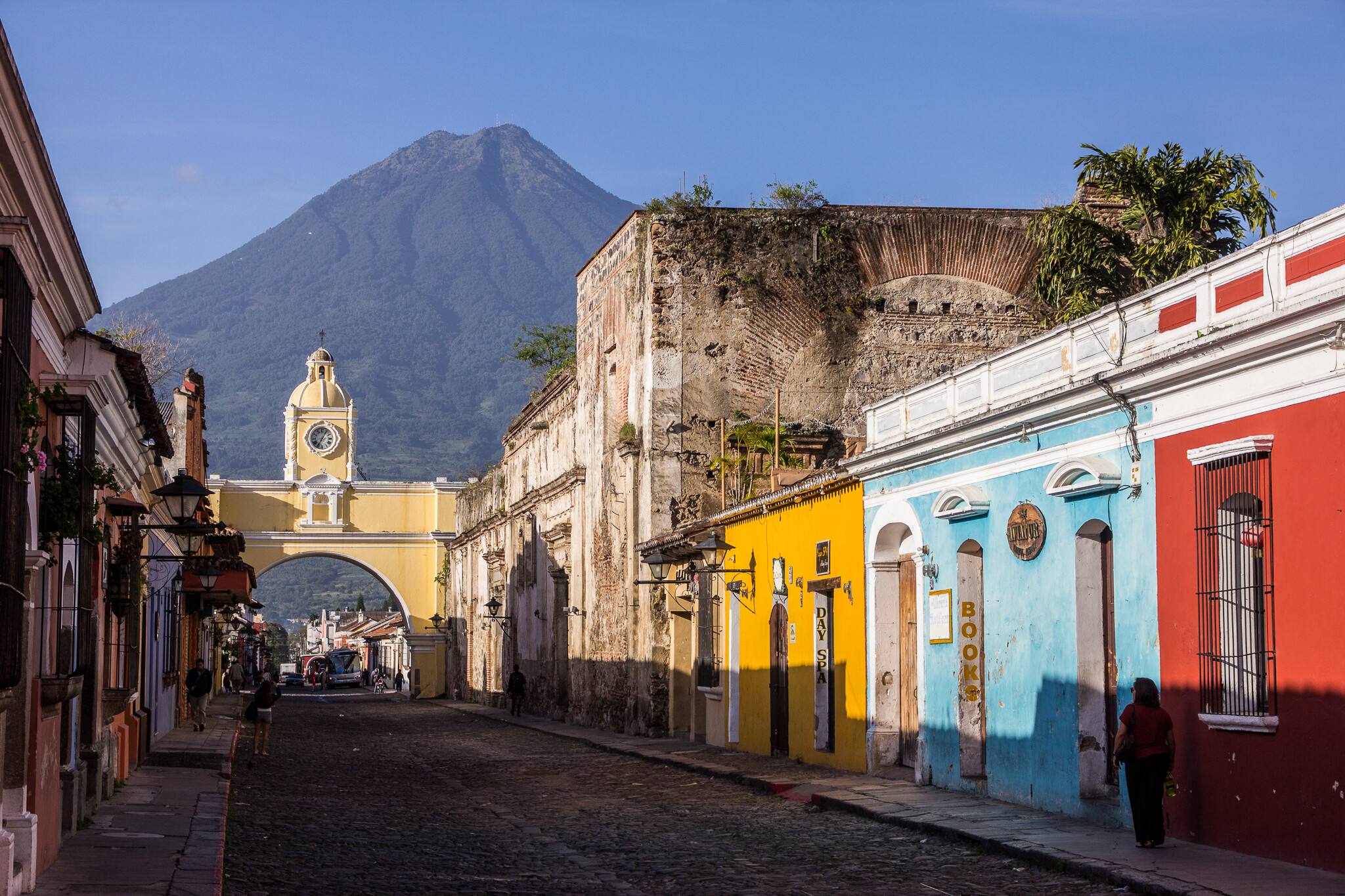 時計台、荒廃した雰囲気とカラフルなコロニアル建築の建物、そしてアグア山。