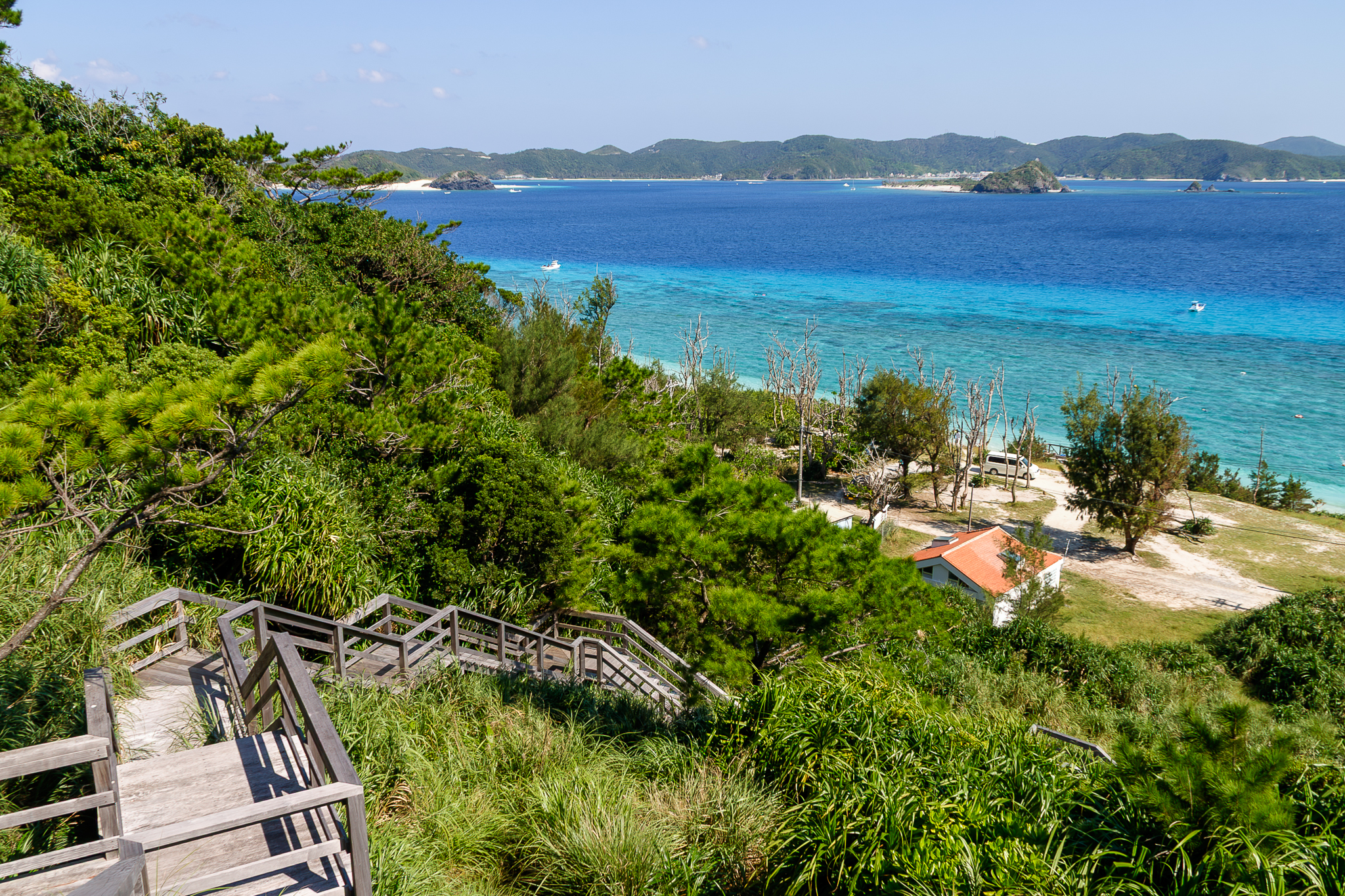 ひと泳ぎして、ニシバマ展望台があるというので登ってみました。ビーチから沖へと続く美しい青のグラデーションがたまらない。向かいに見えているのは、同じく慶良間島諸島の座間味島です。いつかは行ってみたいな。