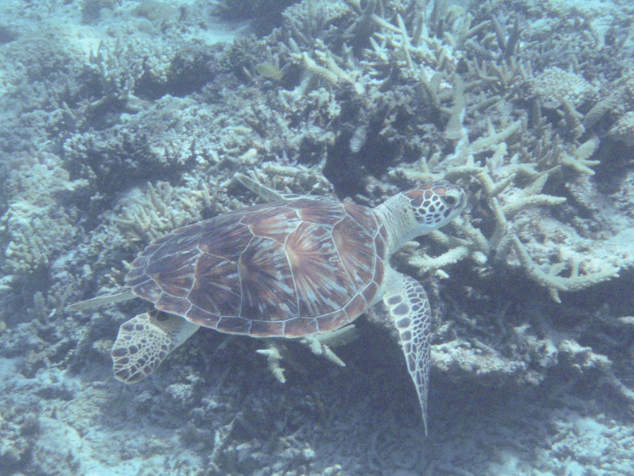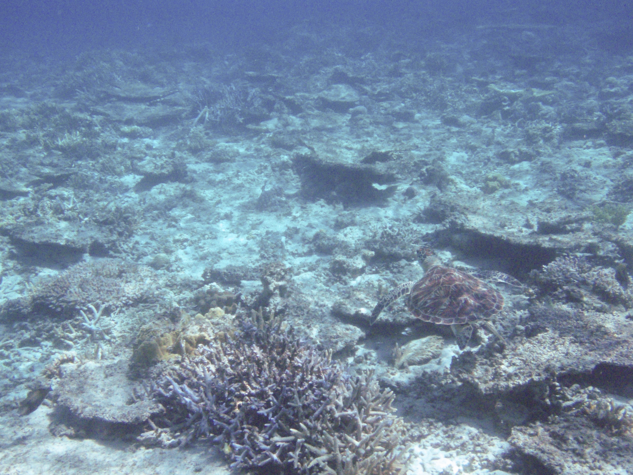 すると真正面に、ゆっくりと手足を動かし泳いでいる海がめが・・・